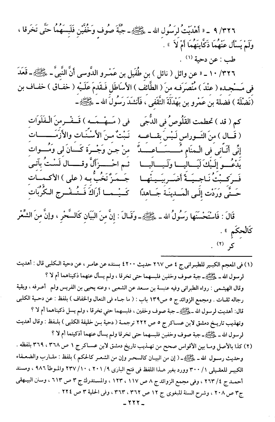326/ 10 - "عن وائل (نائل) بنِ طُفَيل بن عَمْرو الدَّوسى أنَّ النَّبِىَّ - صلى الله عليه وسلم - قَعَدَ فِى مَسْجِدهِ (عِنْدَ) مُنْصَرَفه مِنَ (الطَّائِف) الأَسَاطَلِ فَقَدِمَ عَلَيْهِ (خفاق) خفاف بن (نَضْلَة) فَضلَة بن عَمْرو بن بَهْدَلَةَ الثَّقَفِى، فَأَنشَدَ رَسُولَ الله - صلى الله عليه وسلم -