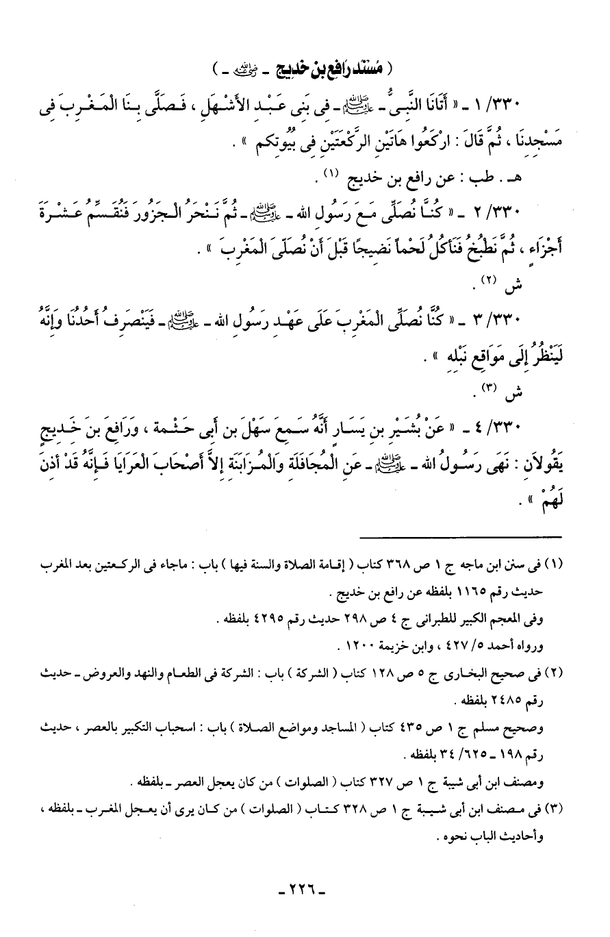 330/ 3 - "كُنَّا نُصَلِّى الْمَغْرِبَ عَلَى عَهْدِ رَسُولِ الله - صلى الله عليه وسلم - فَيَنْصَرِفُ أَحُدُنَا وَإِنَّهُ لَيَنْظُرُ إِلَى مَوَاقِع نَبْلِهِ".