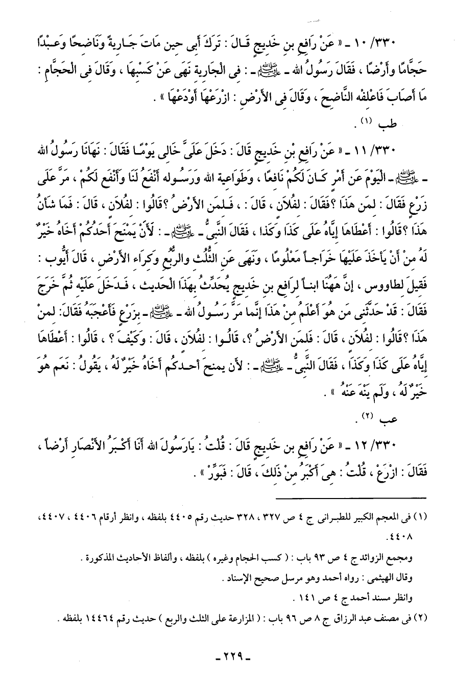330/ 12 - "عَنْ رَافِعِ بن خَدِيجٍ قَالَ: قُلْتُ: يَا رَسُولَ الله أَنَا أَكْبَرُ الأَنْصَارِ أَرْضًا، فَقَالَ: ازْرَعْ، قُلْتُ: هِىَ أَكْبَرُ مِنْ ذَلِكَ، قَالَ: فَبَوِّرْ".