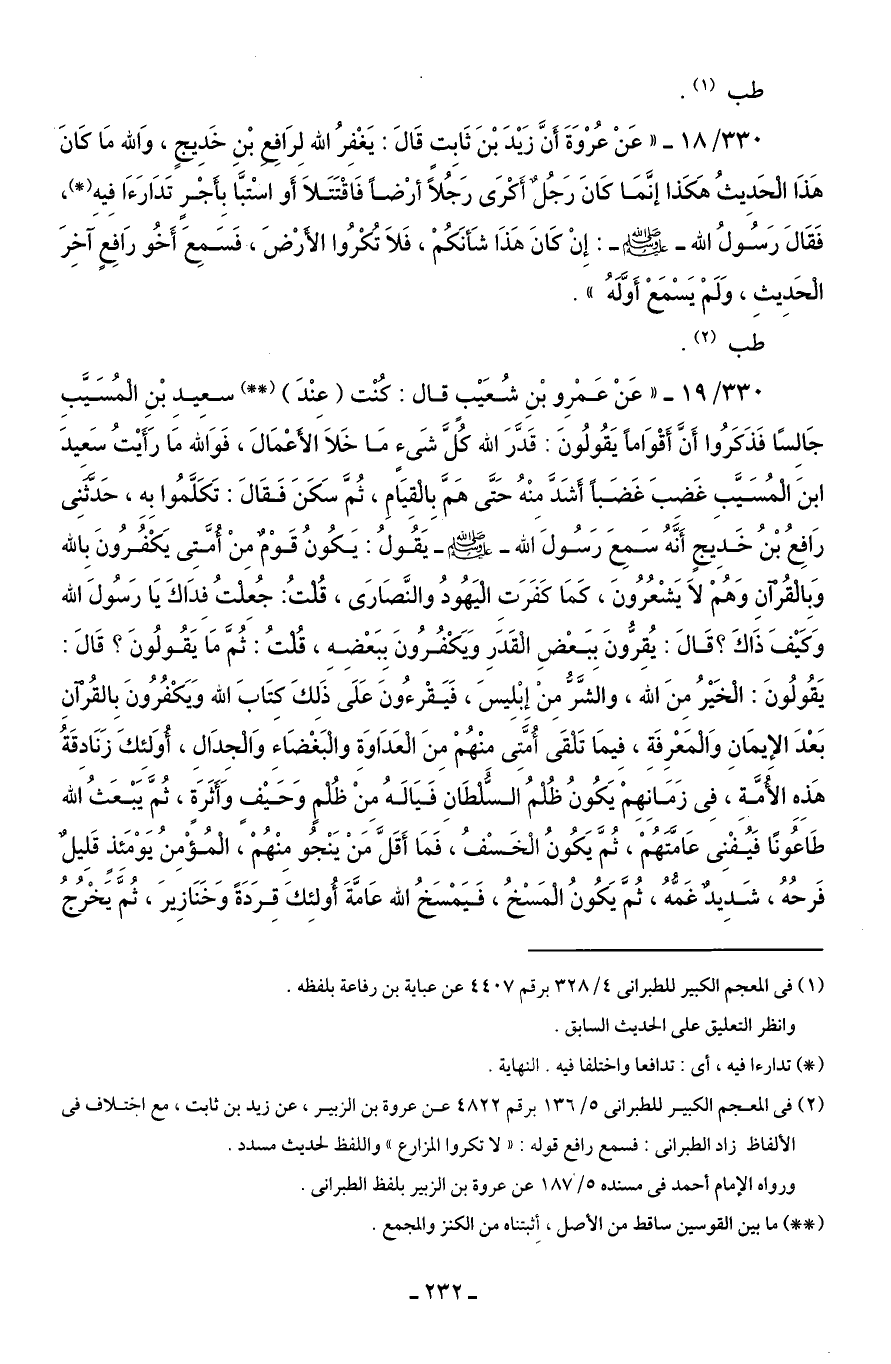 330/ 19 - "عَنْ عَمْرِو بْنِ شُعَيْبٍ قال: كُنْت (عِنْدَ) (* *) سعِيدِ بْنِ الْمُسَيَّبِ جَالِسًا فَذَكَرُوا أَنَّ أَقْوَامًا يَقُولُونَ: قَدَّرَ الله كُلَّ شَئٍ مَا خَلَا الأَعْمَالَ، فَوَالله مَا رَأَيْتُ سَعِيدَ ابنَ الْمُسَيَّبِ غَضِبَ غَضَبًا أَشَدَّ مِنْهُ حَتَّى هَمَّ بِالْقِيَامِ، ثُمَّ سَكَنَ فَقَالَ: تَكَلَّمُوا بِهِ، حَدَّثَنِى رَافِعُ بْنُ خَدِيجٍ أَنَّهُ سَمِعَ رَسُولَ الله - صلى الله عليه وسلم - يَقُولُ: يَكُونُ قَوْمٌ مِنْ أُمَّتِى يَكْفُرُونَ بالله وَبِالْقُرْآنِ وَهُمْ لَا يَشْعُرُونَ، كمَا كفَرَتِ الْيَهُودُ والنَّصَارَى، قُلْتُ: جُعِلْتُ فِدَاكَ يَا رَسُولَ الله وَكَيْفَ ذَاكَ؟ قَالَ: يُقِرُّونَ بِبَعْضِ الْقَدَرِ وَيَكْفُرُونَ بِبَعْضِهِ، قُلْتُ: ثُمَّ مَا يَقُولُونَ؟ قَالَ: يَقُولُونَ: الْخَيْرُ مِنَ الله، والشَّرُّ مِنْ إِبْلِيسَ، فَيَقْرءُونَ عَلَى ذَلِكَ كِتَابَ الله وَيَكْفُرُونَ بِالقُرْآنِ بَعْدَ الإِيمَانِ وَالْمَعْرِفَةِ، فِيمَا تَلْقَى أُمَّتِى منْهُمْ مِنَ الْعَدَاوَةِ والْبَغْضَاءِ وَالْجِدَالِ، أُوَلئِكَ زَنَادِقَةُ هَذِهِ الأُمَّةِ، فِى زَمَانِهِمْ يَكُونُ ظُلْمُ السُّلْطَانِ فَيَالَهُ مِنْ ظُلْمٍ وَحَيْفٍ وأَثَرَةٍ، ثُمَّ يَبْعَثُ الله طَاعُونًا فَيُفْنِى عَامَّتَهُمْ، ثُمَّ يَكُونُ الْخَسْفُ، فَمَا أَقَلَّ مَنْ يَنْجُو مِنْهُمْ، الْمُؤْمِنُ يَوْمَئذٍ قَلِيلٌ فَرحُهُ، شَدِيدٌ غَمُّهُ، ثُمَّ يَكُونُ الْمَسْخُ، فَيَمْسَخُ الله عَامَّةَ أُولئِكَ قِرَدَةً وَخَنَازِيرَ، ثُمَّ يَخْرُجُ