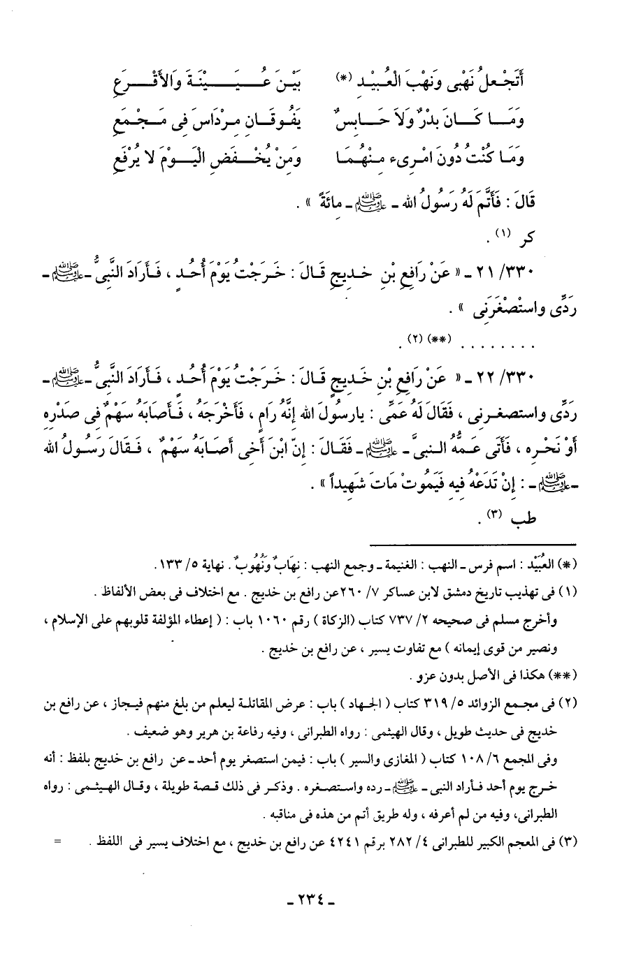 330/ 21 - "عَنْ رَافِعِ بْنِ خدِيجِ قَالَ: خَرَجْتُ يَوْمَ أُحُدٍ، فَأَرَادَ النَّبِىُّ - صلى الله عليه وسلم - رَدِّى واستْصْغَرَنِى".