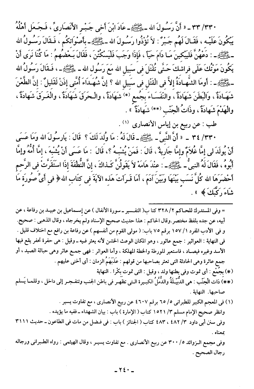 330/ 33 - "أَنَّ رَسُولَ الله - صلى الله عليه وسلم - عَادَ ابْنَ أَخِى جَبْرِ الأَنَصَارِىِّ، فَجَعَل أَهْلُهُ يَبْكُونَ عَلَيْهِ، فَقَالَ لَهُم جَبْرٌ: لَا تُؤْذُوا رَسُولَ الله - صلى الله عليه وسلم - بأَصْوَاتِكُم، فَقَالَ رَسُولُ الله - صلى الله عليه وسلم -: دَعْهُنَّ فَليَبْكِينَ مَا دَامَ حَيًّا، فَإِذَا وَجَبَ فَلْيَسْكُتْنَ، فَقَالَ بَعْضُهمُ: مَا كُنَا نَرَى أَنْ يَكُونَ مَوْتُكَ عَلَى فِراشِكَ حَتَّى تُقْتَلَ فِى سَبِيلِ الله مَعَ رَسُولِ الله - صلى الله عليه وسلم -، فَقَالَ رَسُولُ الله - صلى الله عليه وسلم -: أَومَا الشَّهادَةُ إِلَّا فِى الْقَتْلِ فِى سَبيلِ الله؟ إنَّ شُهَدَاءَ أُمَّتِى إِذَنْ لَقَلِيلٌ: إِنَّ الطَّعْنَ شَهَادَةٌ، وَالْبَطَنَ شَهَادَةٌ، والنّفَسَاءَ بِجُمعٍ (*) شَهَادَةٌ، والْحَرَقَ شَهَادَةٌ، والْغَرَقَ شَهَادَةٌ، والَهَدْمَ شَهادَةٌ، وذَاتُ الْجَنْبِ (* *) شَهادَةٌ".