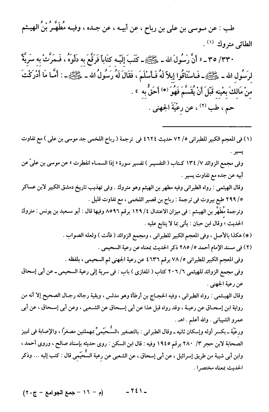 وقال الهيثمى: رواه الطبرانى وفيه مطهر بن الهيثم وهو متروك. وفى تهذيب تاريخ دمشق الكبير لابن عساكر 5/ 299 طبع بيروت في ترجمة: رباح بن قصير اللخمى، مع تفاوت قليل.