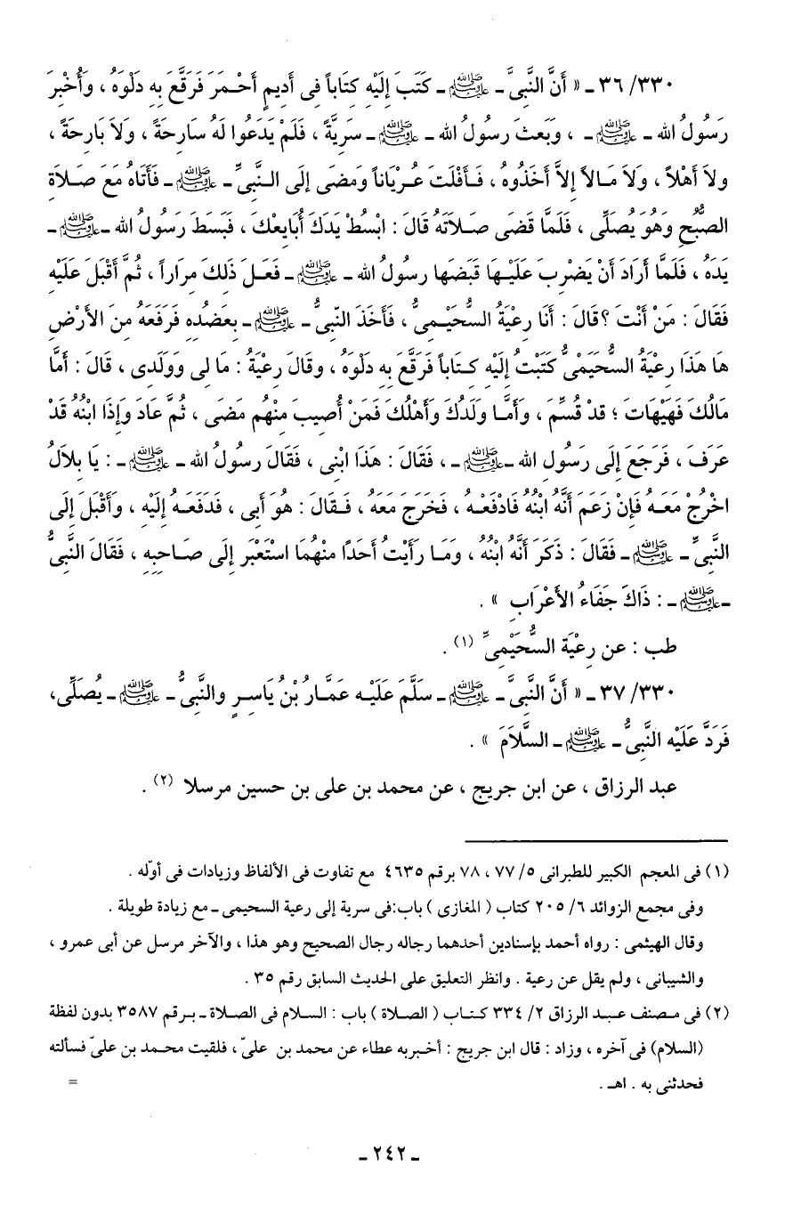330/ 36 - "أَنَّ النَّبِىَّ - صلى الله عليه وسلم - كَتَبَ إِلَيْهِ كِتَابًا فِى أَدِيمٍ أَحْمَرَ فَرَقَّعَ بِهِ دَلْوَهُ، وَأُخْبِرَ رَسُولُ الله - صلى الله عليه وسلم -، وَبَعثَ رسُولُ الله - صلى الله عليه وسلم - سَرِيَّةً، فَلَم يَدَعُوا لَهُ سَارِحةً، وَلاَ بَارِحةً، ولاَ أَهْلًا، وَلَا مَالًا إِلَّا أَخَذُوهُ، فَأَفْلَتَ عُرْيَانًا وَمضَى إلَى النَّبِىِّ - صلى الله عليه وسلم - فَأَتَاهُ مَعَ صَلاَةِ الصُّبُحِ وَهُوَ يُصَلِّى، فَلَمَّا قَضَى صَلاَتَهُ قَالَ: ابْسُطْ يَدَكَ أُبَايِعْكَ، فَبَسَطَ رَسُولُ الله - صلى الله عليه وسلم - يَدَهُ، فَلَمَّا أَرَادَ أَنْ يَضْرِبَ عَلَيْها قَبَضَها رسُولُ الله - صلى الله عليه وسلم - فَعَلَ ذَلِكَ مِرَارًا، ثُمَّ أَقْبَلَ عَلَيْهِ فَقَالَ: مَنْ أَنْتَ؟ قَالَ: أَنَا رِعْيَةُ السُّحَيْمِىُّ، فَأَخَذَ النّبِىُّ - صلى الله عليه وسلم - بِعَضُدِهِ فَرَفَعَهُ مِنَ الأَرْضِ هَا هَذَا رِعْيَةُ السُّحَيَمْىُّ كَتَبْتُ إِلَيْهِ كِتَابًا فَرَقَّعَ بِهِ دَلْوَهُ، وقَالَ رِعْيَةُ: مَا لِى وَوَلَدِى، قَالَ: أَمَّا مَالُكَ فَهَيْهَاتَ؛ قدْ قُسِّمَ، وَأَمَّا وَلَدُكَ وَأَهْلُكَ فَمَنْ أُصِيبَ مِنْهُم مَضَى، ثُمَّ عَادَ وَإِذَا ابْنُهُ قَدْ عَرَفَ، فَرَجَعَ إِلَى رَسُولِ الله - صلى الله عليه وسلم -، فَقَالَ: هذَا ابْنِى، فَقَالَ رسُولُ الله - صلى الله عليه وسلم -: يَا بِلَالُ اخْرُجْ مَعَهُ فَإِنْ زَعَمَ أَنَّهُ ابْنُهُ فَادْفَعْهُ، فَخَرَجَ مَعَهُ، فَقَالَ: هُوَ أَبِى، فَدَفَعَهُ إِلَيْهِ، وَأَقْبَلَ إِلَى النَّبِىِّ - صلى الله عليه وسلم - فَقَالَ: ذَكَرَ أَنَّهُ ابْنُهُ، وَمَا رَأَيْتُ أَحَدًا منْهُمَا اسْتَعْبَر إِلَى صَاحِبِهِ، فَقَالَ النَّبِىُّ - صلى الله عليه وسلم -: ذَاكَ جَفَاءُ الأَعْرَابِ".