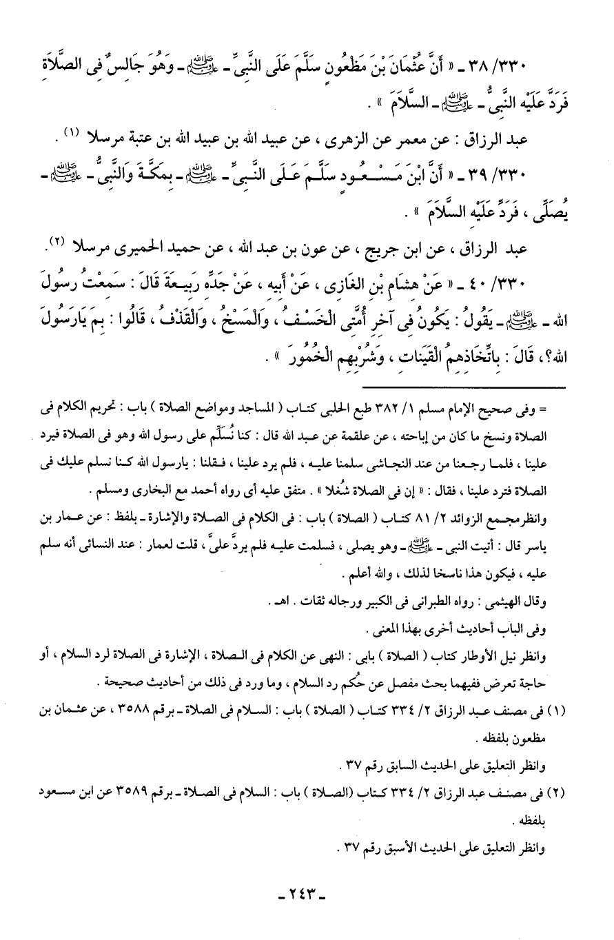 330/ 39 - "أَنَّ ابْنَ مَسْعُودٍ سَلَّمَ عَلَى النَّبِىِّ - صلى الله عليه وسلم - بِمَكَّةَ وَالنَّبِىُّ - صلى الله عليه وسلم - يُصَلِّى، فَرَدَّ عَلَيْهِ السَّلَامَ".
