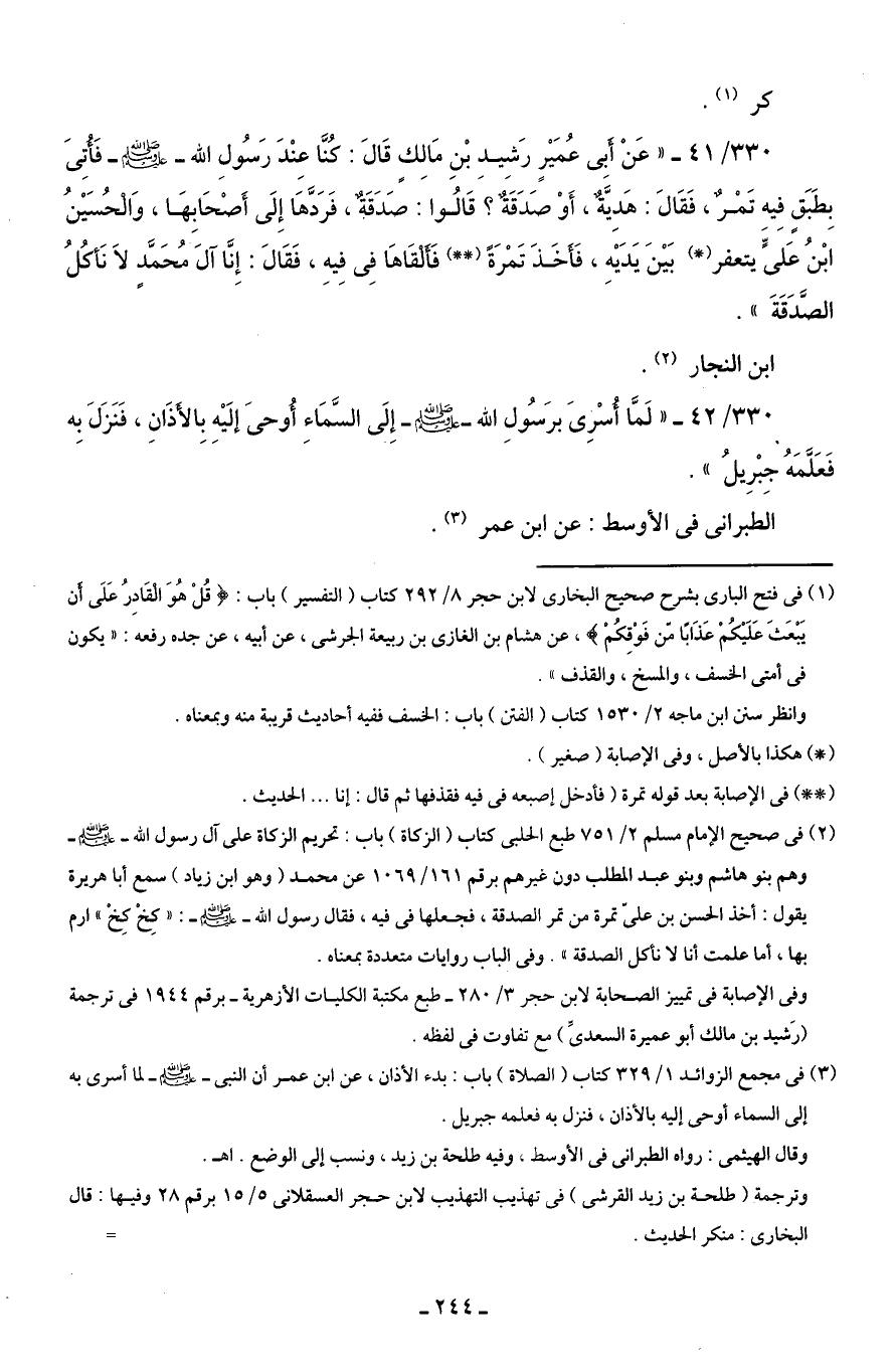 330/ 41 - "عَنْ أَبِى عُمَيْرٍ رَشِيدِ بْنِ مَالِكٍ قَالَ: كُنَّا عِنْدَ رَسُولِ الله - صلى الله عليه وسلم - فَأُتِىَ بِطَبَقٍ فِيه تَمْرٌ، فَقَالَ: هَدِيَّةٌ، أَوْ صَدَقَةٌ؟ قَالُوا: صَدَقَةٌ، فَرَدَّها إِلَى أَصْحَابِهَا، وَالْحُسَيْنُ ابْنُ عَلىٍّ يتعفر (*) بَيْنَ يَدَيْهِ، فَأَخَذَ تَمْرَةً (* *) فَأَلْقَاهَا فِى فِيهِ، فَقَالَ: إِنَّا آلَ مُحَمَّدٍ لَا نَأكُلُ الصَّدَقَةَ".