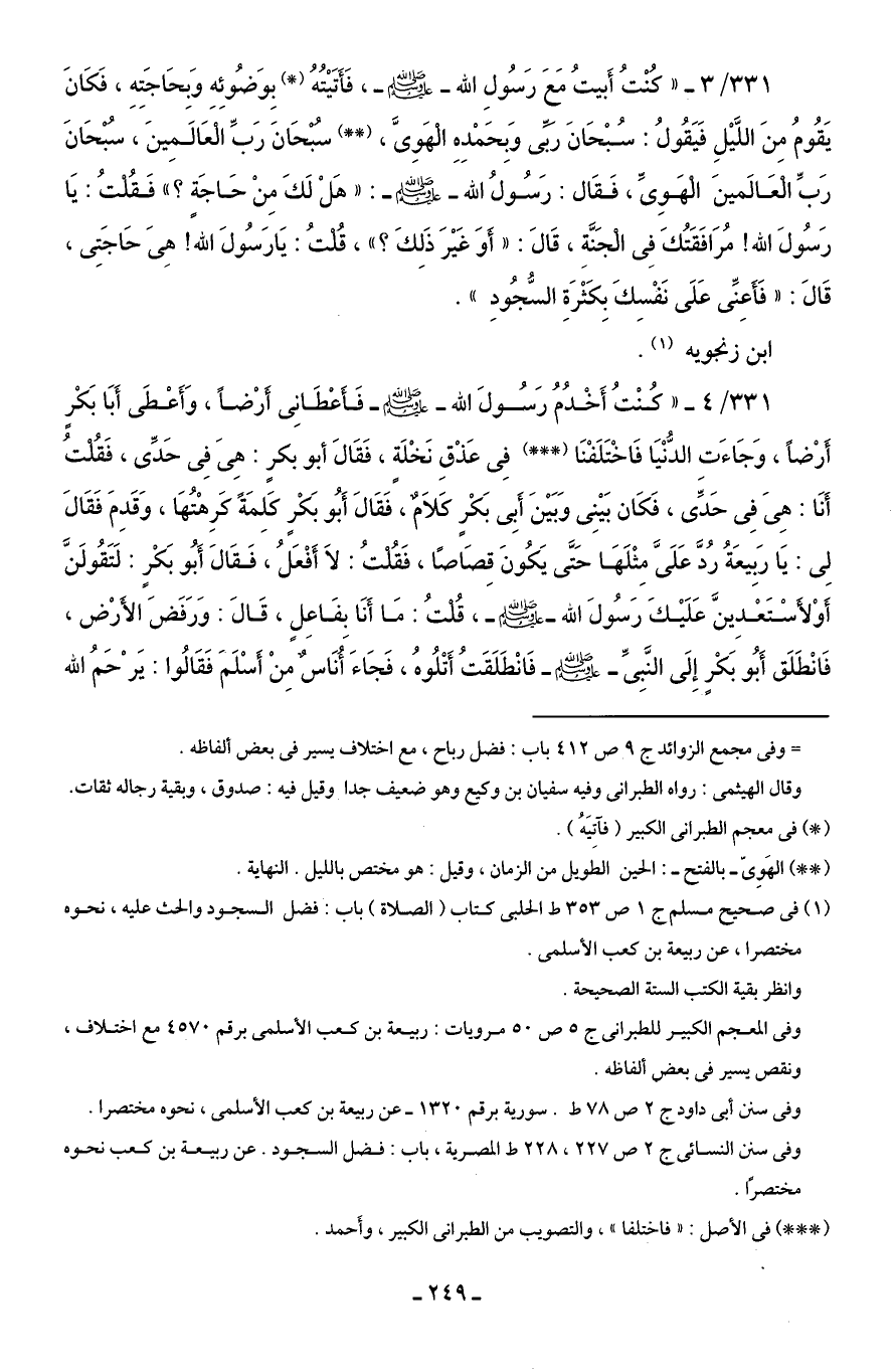 331/ 3 - "كُنْتُ أَبيتُ مَعَ رَسُولِ الله - صلى الله عليه وسلم -، فَأَتَيْتُهُ (*) بِوَضُوئِهِ وَبِحَاجَتِهِ، فَكَانَ