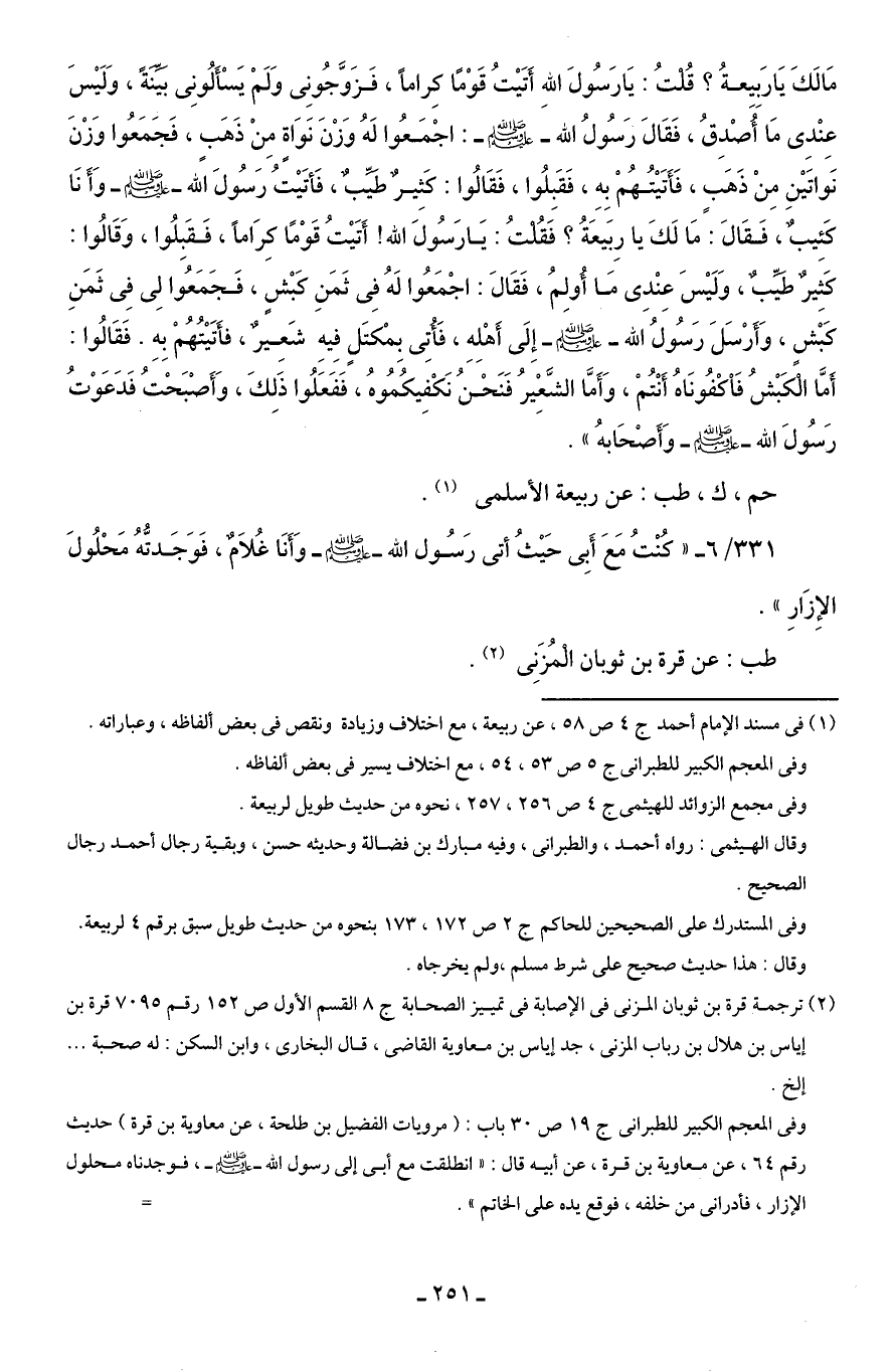 331/ 6 - "كُنْتُ مَعَ أَبِى حَيْثُ أتى رَسُول الله - صلى الله عليه وسلم - وَأَنَا غُلَامٌ، فَوَجَدتُّهُ مَحْلُولَ الإِزَارِ".