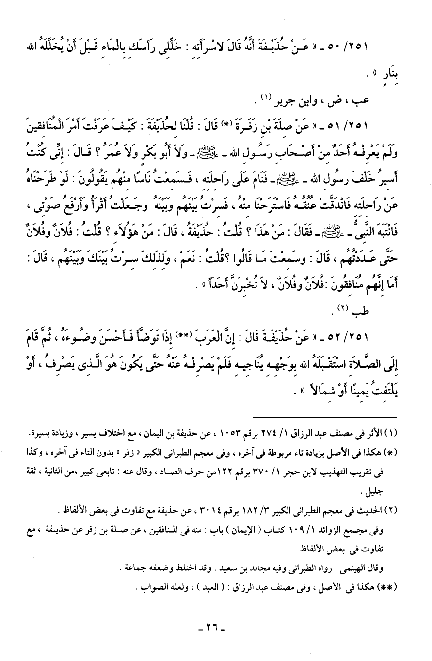 251/ 52 - "عَنْ حُذَيْفَةَ قَالَ: إِنَّ الْعَرَبَ (* *) إِذَا تَوَضأَ فَأَحْسَنَ وضُوءَهُ، ثُمَّ قَامَ إِلَى الصَّلَاةِ اسْتَقْبَلَهُ الله بِوَجْهِهِ يُنَاجِيهِ فَلَمْ يَصْرِفْهُ عَنْهُ حَتَّى يَكُونَ هُوَ الَّذِى يَصْرِفُ، أَوْ يَلْتَفِتُ يَمِينًا أَوْ شِمَالًا".