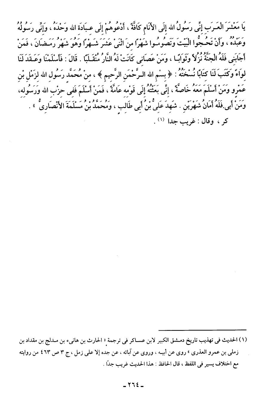 (¬1) الحديث في تهذيب تاريخ دمشق الكبير لابن عساكر في ترجمة "الحارث بن هانئ بن مدلج بن مقداد بن زملى بن عمرو العذرى" روى عن أبيه، وروى عن آبائه، عن جده إلا على زمل، ج 3 ص 463 من روايته مع اختلاف يسير في اللفظ، قال الحافظ: هذا الحديث غريب جدًّا.