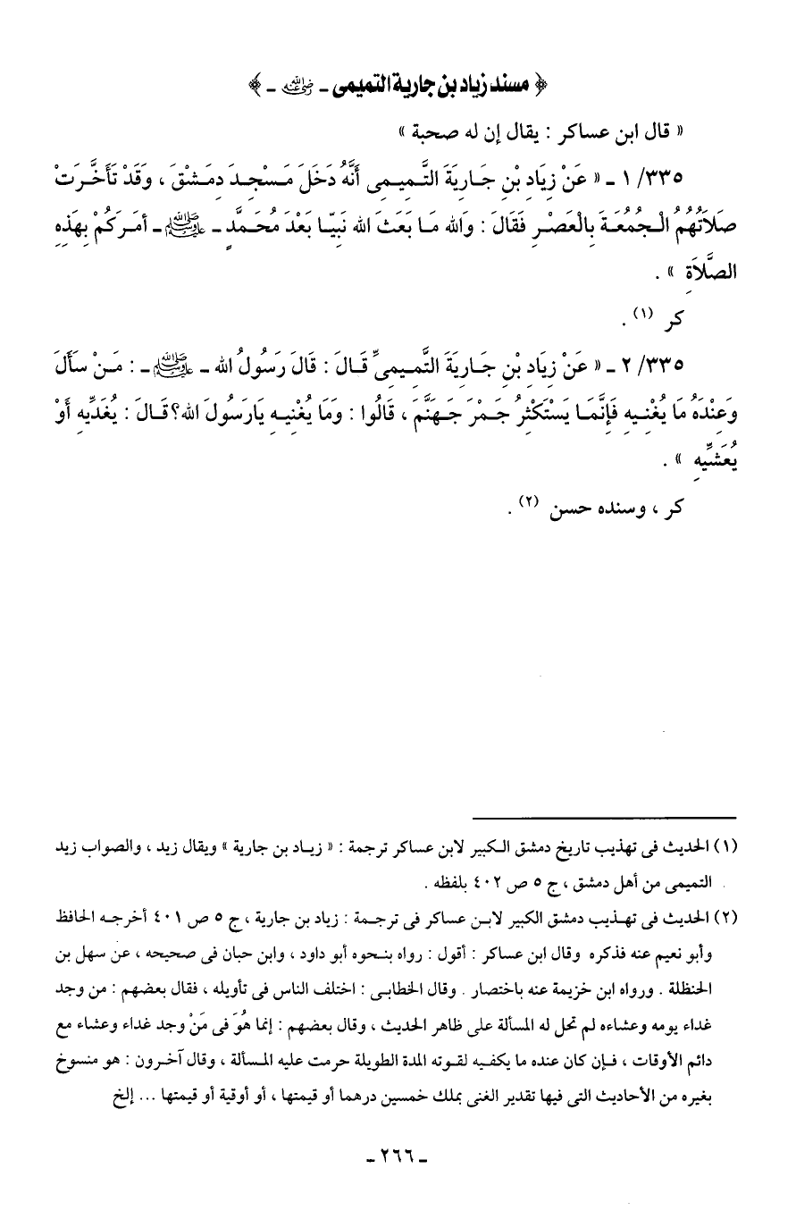335/ 2 - "عَنْ زِيَادِ بْنِ جَارِيَةَ التَّمِيمِىِّ قَالَ: قَالَ رَسُولُ الله - صلى الله عليه وسلم -: مَنْ سَأَلَ وَعِنْدَهُ مَا يُغْنِيهِ فَإِنَّمَا يَسْتَكْثِرُ جَمْرَ جَهَنَّمَ، قَالُوا: وَمَا يُغْنِيهِ يَا رَسُولَ الله؟ قَالَ: يُغَدِّيهِ أَوْ يُعَشِّيه".