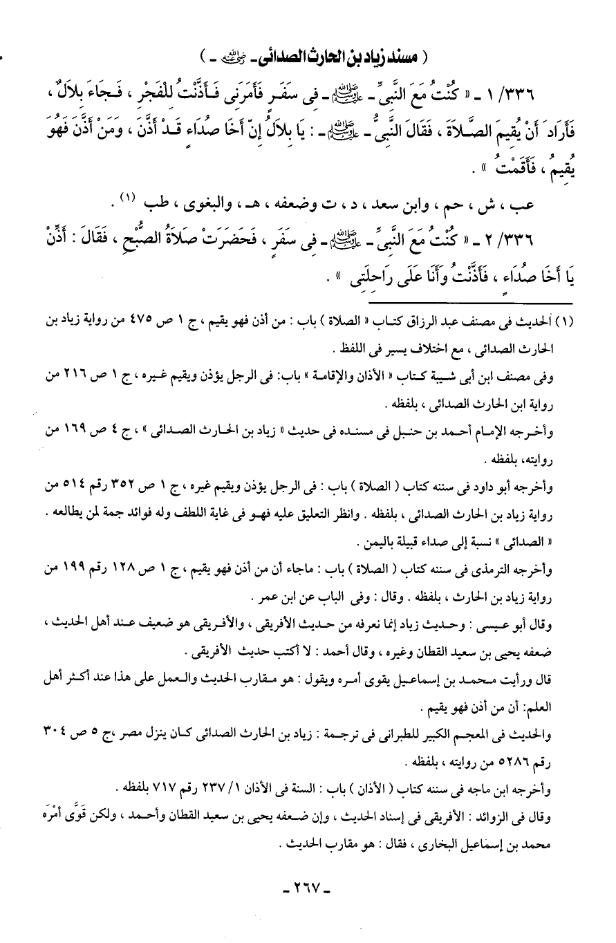 336/ 2 - "كُنْتُ مَعَ النَّبِىِّ - صلى الله عليه وسلم - فِى سَفَرٍ، فَحَضَرَتْ صَلَاةُ الصُّبْحِ، فَقَالَ: أَذِّنْ يَا أَخَا صُدَاءٍ، فَأَذَّنْتُ وَأَنَا عَلَى رَاحِلَتِى".