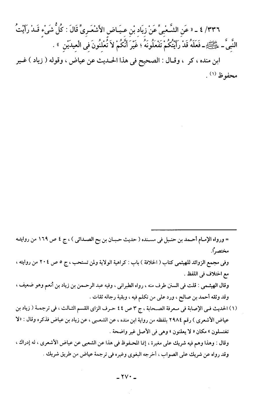 336/ 4 - "عَنِ الشَّعْبِيِّ عَنْ زِيَادِ بْنِ عِيَاضٍ الأَشْعَرِىِّ قَالَ: كُلُّ شَىْءٍ قَدْ رَأَيْتُ النَّبِىَّ - صلى الله عليه وسلم - فَعَلَهُ قَدْ رَأَيْتُكُمْ تَفْعَلُونَهُ؛ غَيْرَ أَنَّكُمْ لاَ تُعْلِنُونَ فِى الْعِيدَيْنِ".