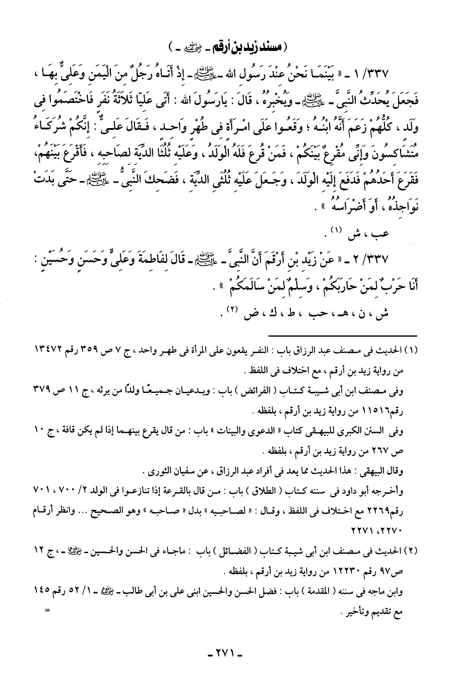 337/ 2 - "عَنْ زَيْدِ بْنِ أَرْقَمَ أَنَّ النَّبِىَّ - صلى الله عليه وسلم - قَالَ لِفَاطِمَةَ وَعَلِىٍّ وَحَسَنٍ وَحُسَيْنٍ: أنَا حَرْبٌ لِمَنْ حَارَبَكُمْ، وَسِلْمٌ لِمَنْ سَالَمَكُمْ".