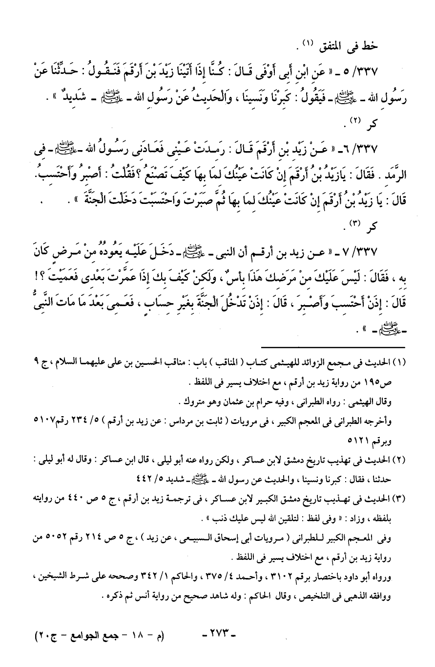337/ 6 - "عَنْ زَيْدِ بْنِ أَرْقَمَ قَالَ: رَمِدَتْ عَيْنِى فَعَادَنِى رَسُولُ الله - صلى الله عليه وسلم - فِى الرَّمَدِ. فَقَالَ: يَا زَيْدُ بْنُ أَرْقَمَ إِنْ كَانَتْ عَيْنُكَ لِمَا بِهَا كَيْفَ تَصْنَعُ؟ فَقُلْتُ: أَصْبِرُ وَأَحْتَسِبُ. قَالَ: يَا زَيْدُ بْنُ أَرْقَمَ إِنْ كَانَتْ عَيْنُكَ لِمَا بِهَا ثُمَّ صَبَرْتَ وَاحْتَسَبْتَ دَخَلْتَ الْجَنَّةَ".