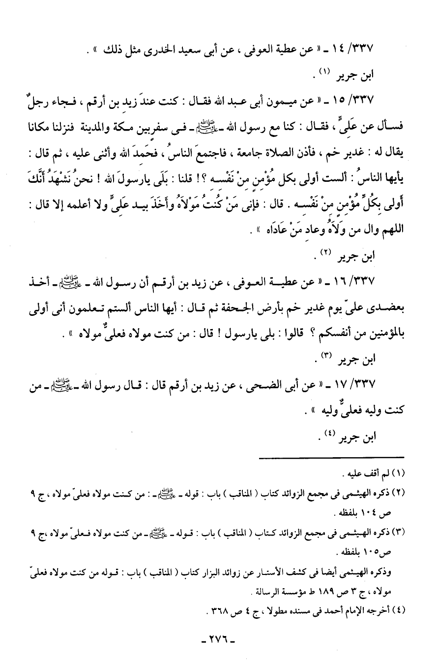 337/ 16 - "عن عطية العوفى، عن زيد بن أرقم أن رسول الله - صلى الله عليه وسلم - أخذ بعضدى علىّ يوم غدير خم بأرض الجحفة ثم قال: أيها الناس ألستم تعلمون أنى أولى بالمؤمنين من أنفسكم؟ قالوا: بلى يا رسول! قال: من كنت مولاه فعلىٌّ مولاه".