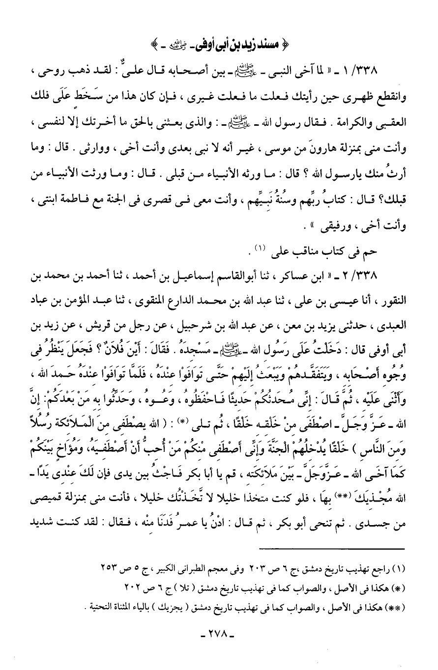 338/ 2 - "ابن عساكر، ثنا أبو القاسم إسماعيل بن أحمد، ثنا أحمد بن محمد بن النقور، أنا عيسى بن على، ثنا عبد الله بن محمد الدارع المنقوى، ثنا عبد المؤمن بن عباد العبدى، حدثنى يزيد بن معن، عن عبد الله بن شرحبيل، عن رجل من قريش، عن زيد بن أبي أوفى قال: دَخَلْتُ عَلَى رَسُولِ الله - صلى الله عليه وسلم - مَسْجِدَهُ. فَقَالَ: أَيْنَ فُلَانٌ؟ فَجَعَلَ يَنْظُرُ فِى وُجُوهِ أَصْحَابِهِ، وَيَتَفَقَّدهُمْ وَيَبْعَثُ إِلَيْهِمْ حَتَّى تَوَافَوْا عِنْدَهُ، فَلَمَّا تَوَافَوْا عِنْدَهُ حَمِدَ الله، وَأَثْنَى عَلَيْهِ، ثُمَّ قَالَ: إِنِّى مُحَدثُكُمْ حَدِيثًا فَاحْفَظُوهُ، وَعُوهُ، وَحَدِّثُوا بِهِ مَنْ بَعْدَكُمْ: إِنَّ الله - عَزَّ وَجَلَّ- اصْطَفَى مِنْ خَلْقهِ خَلْقًا، ثُم تلى (*): {اللَّهُ يَصْطَفِي مِنَ الْمَلَائِكَةِ رُسُلًا وَمِنَ النَّاسِ} خَلْقًا يُدْخِلُهُمْ الْجَنَّةَ وَإِنِّى أَصْطَفِى مْنِكُمْ مَنْ أُحِبُّ أَنْ أَصْطَفِيَهُ، وَمُؤَاخٍ بَيْنَكُمْ كَمَا آخَى الله - عَزَّ وجَلَّ- بَيْنَ مَلاَئِكَتهِ، قم يا أبا بكر فَاجْثُ بين يدى فإن لَكَ عِنْدِى يَدًا- الله مُجْذِيَكَ (* *) بِهَا، فلو كانت متخذا خليلا لا تَّخَذْتُك خليلا، فأنت منى بمنزلة قميصى من جسدى. ثم تنحى أبو بكر، تم قال. ادْنُ يا عمرُ فَدَنَا مِنْه، فقال: لقد كنت شديد