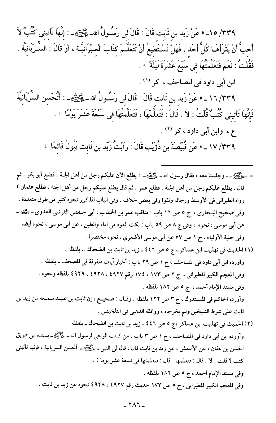 وأورده ابن أبى داود فِى المصاحف، ج 1 ص 3 باب: من كتب الوحى لرسول الله - صلى الله عليه وسلم - بسنده من طريق الحسن بن عفان، عن الأعمش، عن زيد بن ثابت قال: قال لى النبى - صلى الله عليه وسلم - أتحسن السريانية، فإنها تأتينى كتب؟ قلت: لا. قال: فتعلمها. قال: فتعلمتها فِى تسعة عشر يوما).