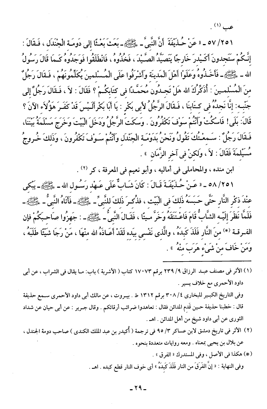 251/ 57 - "عَنْ حُذَيْفَةَ أَنَّ النَّبِىَّ - صلى الله عليه وسلم - بَعَثَ بَعْثًا إِلى دَومَةِ الْجَنْدَلِ، فَقَالَ: إِنَّكُمْ سَتَجِدونَ أَكَيْدِرَ خَارِجًا يَتَصَيَّدُ الصَّيْدَ، فَخُذُوهُ، فَانْطَلَقُوا فَوَجَدُوهُ كَمَا قَالَ رَسُولُ الله - صلى الله عليه وسلم - فَأَخَذُوهُ وَعَلَوْا أَهْلَ الْمَدِينَةِ وَأَشْرَفُوا عَلَى الْمُسْلِمينَ يُكَلِّمُونَهُمْ، فَقَالَ رَجُلٌ مِنَ الْمُسْلِمينَ: أُذَكِّرُكَ الله هَلْ تَجِدُون مُحَمَّدًا فِى كِتَابِكُمْ؟ فَقَالَ: لَا، فَقَالَ رَجُلٌ إِلى جَنْبِهِ: إِنَّا نَجِدُهُ فِى كِتَابِنَا، فَقَالَ الرَّجُلُ لأَبِى بَكْرٍ: يَا أَبَا بَكْر أَلَيْسَ قَدْ كَفَرَ هَؤُلَاءِ الآنَ؟ قَالَ: بَلَى! فَاسْكُتْ وَأَنْتُمْ سَوْفَ تَكْفُرُونَ. وَسَكَتَ الرَّجُلُ وَدَخَلَ الْبَيْتَ وَخَرَجَ مَسْلَمَةُ بَيْنَنَا، فَقَالَ رَجُلٌ: سَمِعْتُكَ تَقُولُ وَنَحْنُ بَدَوْمَةِ الْجَنْدَلِ وَأَنْتُمْ سَوْفَ تَكْفُرونَ، وَذَلِكَ خُروجُ مُسَيْلِمَةَ فَقَالَ: لَا، ولَكِنْ فِى آخِرِ الزَّمَانِ".