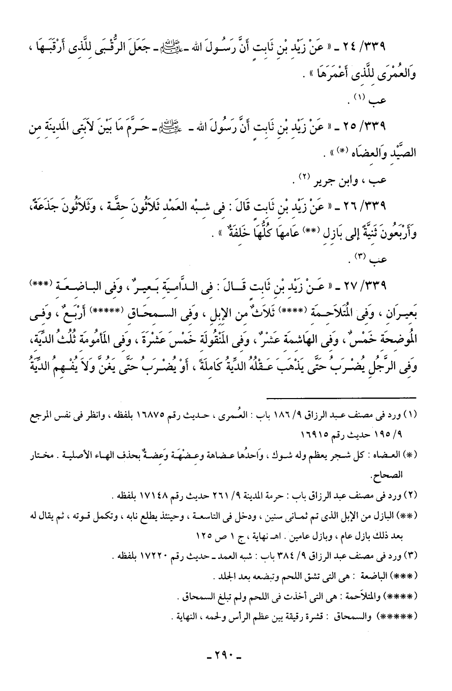 339/ 26 - "عَنْ زَيْدِ بْنِ ثَابِتٍ قَالَ: فِى شِبْه العَمْدِ ثَلاَثُونَ حِقَّة، وَثَلاَثُونَ جَذَعَةً، وَأَرْبَعُونَ ثَنِيَّةً إلى بَازِلِ (* *) عَامهَا كُلُّهَا خَلِفَةٌ".