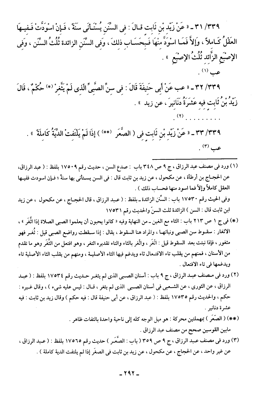 (¬2) ورد فِى مصنف عبد الرزاق، ج 9 باب: أسنان الصبى الذى لم يثغر حديث رقم 17534 بلفظ: (عبد الرزاق، عن الثورى، عن الشعبى فِى أسنان الصبى الذى لم يثغر، قال: ليس عليه شئ)، وقال غيره: حكم، والحديث رقم 17535 بلفظ: (عبد الرزاق، عن أبى حنيفة قال: فيه حكم) وقال زيد بن ثابت: فيه عشرة دنانير.