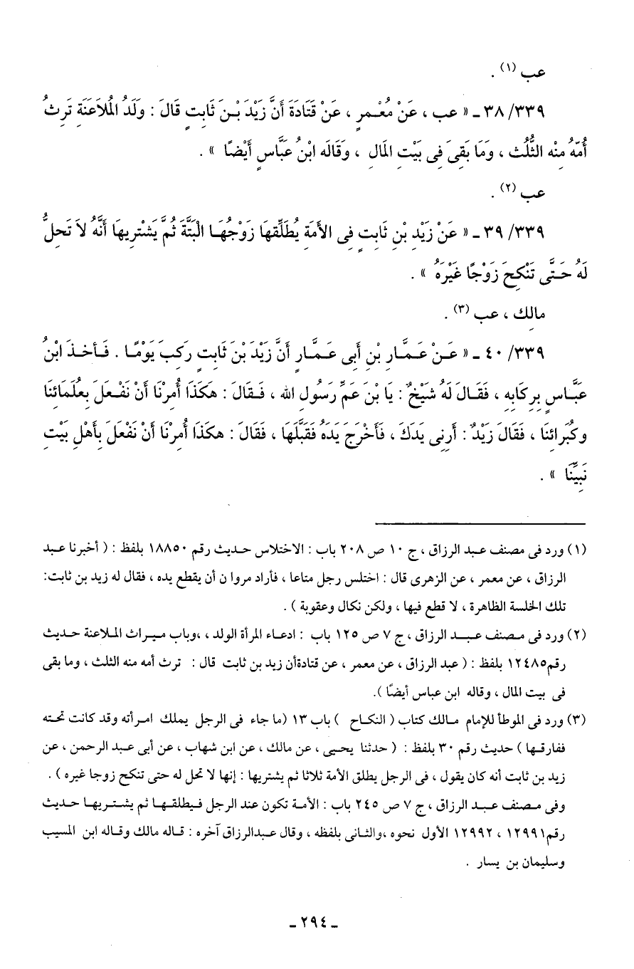 (¬3) ورد فِى الموطأ للإمام مالك كتاب (النكاح) باب 13 (ما جاء فِى الرجل يملك امرأته وقد كانت تحته ففارقها) حديث رقم 30 بلفظ: (حدثنا يحيى، عن مالك، عن ابن شهاب، عن أبى عبد الرحمن، عن زيد بن ثابت أنه كان يقول، فِى الرجل يطلق الأمة ثلاثا ثم يشتريها: إنها لا تحل له حتى تنكح زوجا غيره). وفى مصنف عبد الرزاق، ج 7 ص 245 باب: الأمة تكون عند الرجل فيطلقها ثم يشتريها حديث رقم 12991، 12992 الأول نحوه، والثاني بلفظه، وقال عبد الرزاق آخره: قاله مالك وقاله ابن المسيب وسليمان بن يسار.