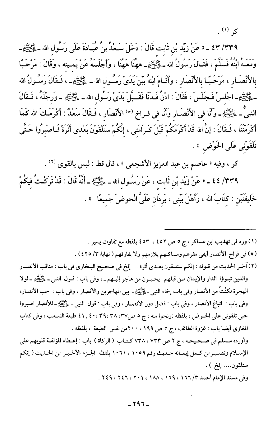 339/ 43 - "عَنْ زَيْدِ بْنِ ثَابِتٍ قَالَ: دَخَلَ سَعْدُ بنُ عُبَادَةَ عَلَى رَسُولِ الله - صلى الله عليه وسلم - وَمَعَهُ ابْنُهُ فَسَلَّمَ، فَقَالَ رَسُولُ الله - صلى الله عليه وسلم - ههُنَا هَهُنَا، وَأَجْلَسَهُ عَنْ يَمِينِه، وَقَالَ: مَرْحَبًا بِالأَنْصَارِ، مَرْحَبًا بِالأَنْصَارِ، وَأَقَامَ ابْنهُ بَيْنَ يَدَىْ رَسُولِ الله - صلى الله عليه وسلم -، فَقَالَ رَسُولُ الله - صلى الله عليه وسلم - اجْلِسْ فَجَلَسَ، فَقَالَ: ادْنُ فَدَنَا فَقَبَّلَ يَدَىْ رَسُولِ الله - صلى الله عليه وسلم - وَرِجْلَهُ، فَقَالَ النبىُّ - صلى الله عليه وسلم - وَأَنَا فِى الأَنْصَارِ وَأَنَا فِى فراخ (*) الأَنْصَارِ، فَقَالَ سَعْدٌ: أَكْرَمَكَ الله كَمَا أَكْرَمْتَنَا، فَقَالَ: إنَّ الله قَدْ أَكْرَمَكُمْ قَبْلَ كَرَامَتِى، إِنَّكُمْ سَتَلْقَوْنَ بَعْدِى أَثَرَةً فَاصْبِرُوا حَتَّى تَلْقَوْنِى عَلى الحَوْضِ".