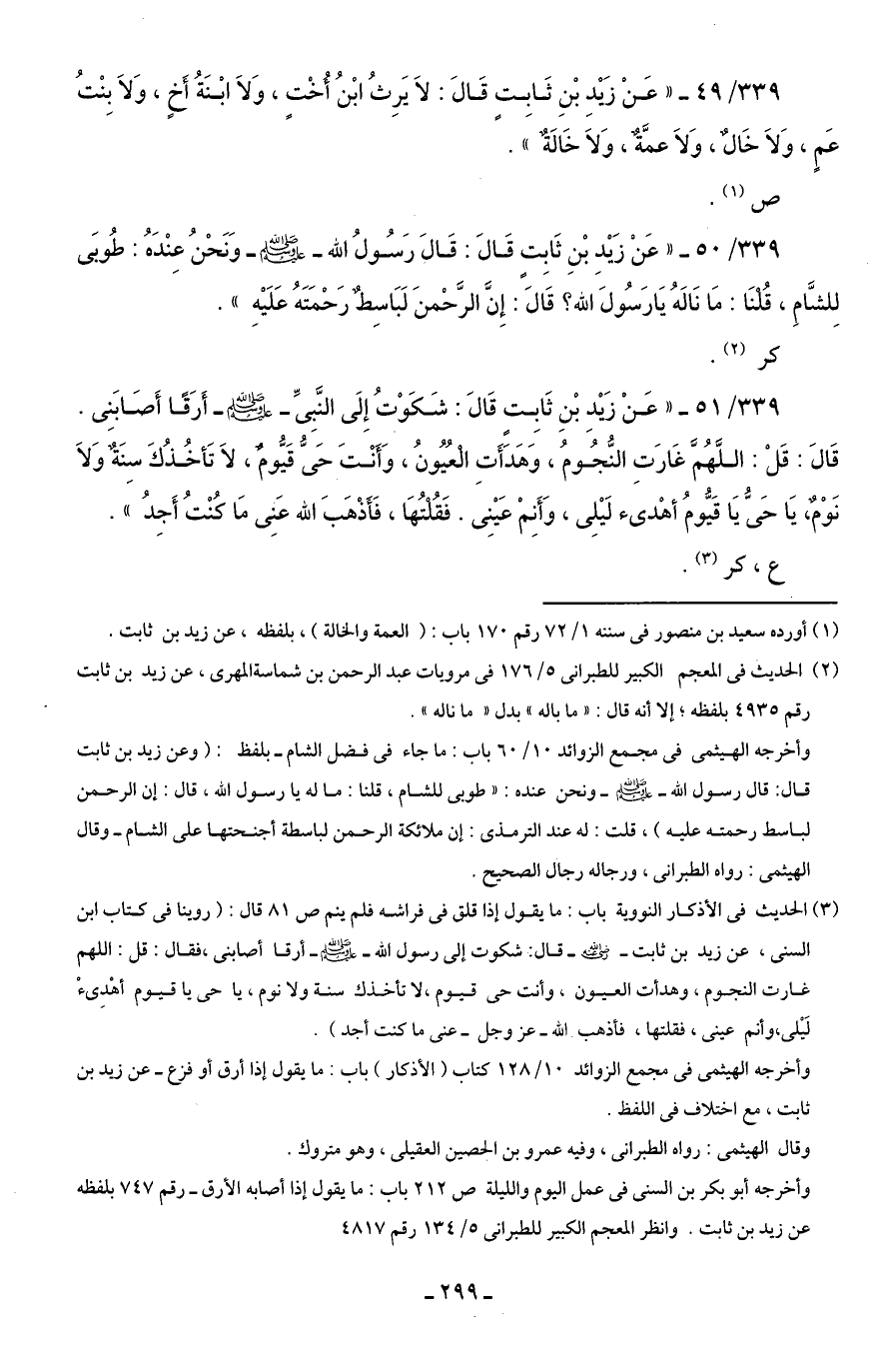 339/ 51 - "عَنْ زَيْدِ بْنِ ثَابِتٍ قَالَ: شَكَوْتُ إِلَى النَّبِىِّ - صلى الله عليه وسلم - أَرَقًا أَصَابَنِى. قَالَ: قُلْ: اللَّهُمَّ غَارَتِ النُّجُومُ، وَهَدَأَتِ الْعُيُونُ، وَأَنْتَ حَىُّ قَيُّومٌ، لَا تَأخُذُكَ سِنَةٌ وَلَا نَوْمٌ، يَا حَىُّ يَا قَيُّومُ أهْدئ لَيْلِى، وَأَنِمْ عَيْنِى. فَقُلْتُهَا، فَأَذْهَبَ الله عَنِى مَا كُنْتُ أَجِدُ".
