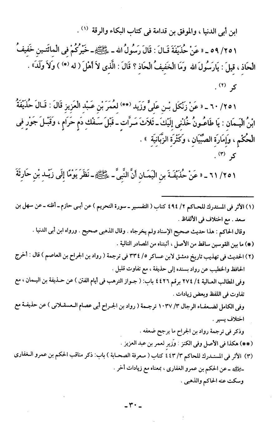 251/ 59 - "عَنْ حُذَيْفَةَ قَالَ: قَالَ رَسُولُ الله - صلى الله عليه وسلم - خَيْرُكُمْ فِى الْمِائَتينِ خَفِيفُ الْحَاذِ، قِيلَ: يَا رَسُولَ الله وَمَا الْخَفِيفُ الْحَاذِ؟ قَالَ: الَّذِى لَا أَهْلَ (له (*)) وَلَا وَلَدَ".