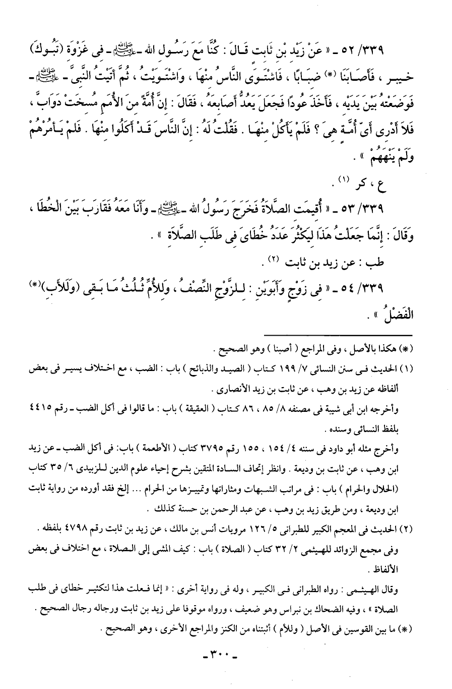 339/ 52 - "عَنْ زَيْدِ بْنِ ثَابِتٍ قَالَ: كُنَّا مَعَ رَسُولِ الله - صلى الله عليه وسلم - فِى غَزْوَةِ (تَبُوكَ) خيبر، فَأَصَابَنَا (*) ضِبَابًا، فَاشْتَوَى النَّاسُ مِنْهَا، وَاشْتَوَيْتُ، ثُمَّ أتَيْتُ النَّبِىَّ - صلى الله عليه وسلم - فَوَضَعْتهُ بَيْنَ يَدَيْهِ، فَأَخَذَ عُودًا فَجَعَلَ يَعُدُّ أَصَابِعَهُ، فَقَالَ: إِنَّ أُمَّةً مِنَ الأُمَمِ مُسِخَتْ دَوَابَّ، فَلَا أَدْرِى أَىّ أُمَّةٍ هِىَ؟ فَلَمْ يَأَكُلْ مِنْهَا. فَقُلْتُ لَهُ: إِنَّ النَّاسَ قَدْ أَكَلُوا مِنْهَا. فَلمْ يَأمُرْهُمْ وَلَمْ يَنْهَهُمْ".