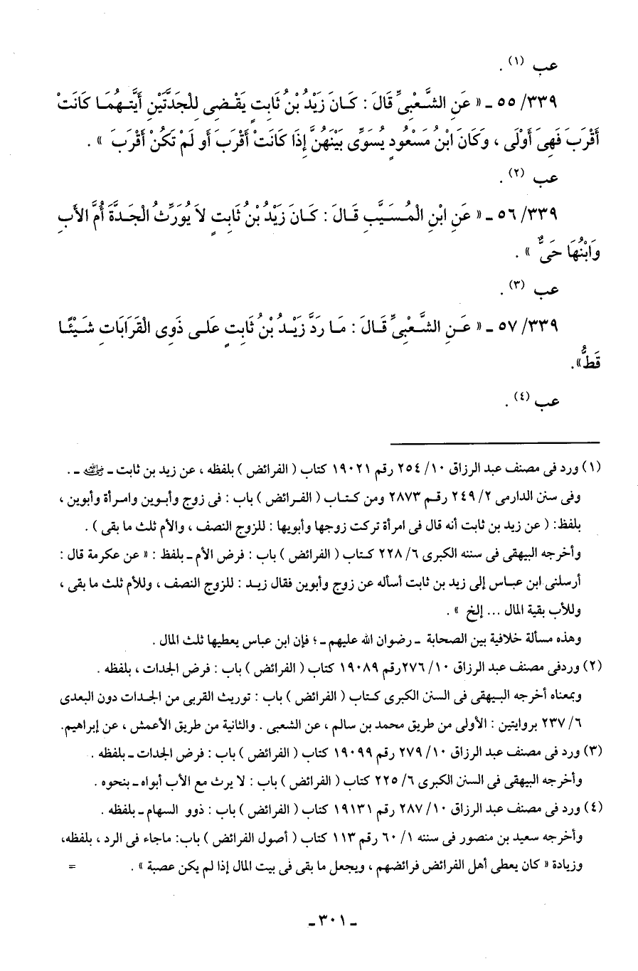 339/ 57 - "عَنِ الشَّعْبِىِّ قَالَ: مَا رَدَّ زَيْدُ بْنُ ثَابِتٍ عَلى ذَوِى الْقَرَابَاتِ شَيْئًا قَطُّ".