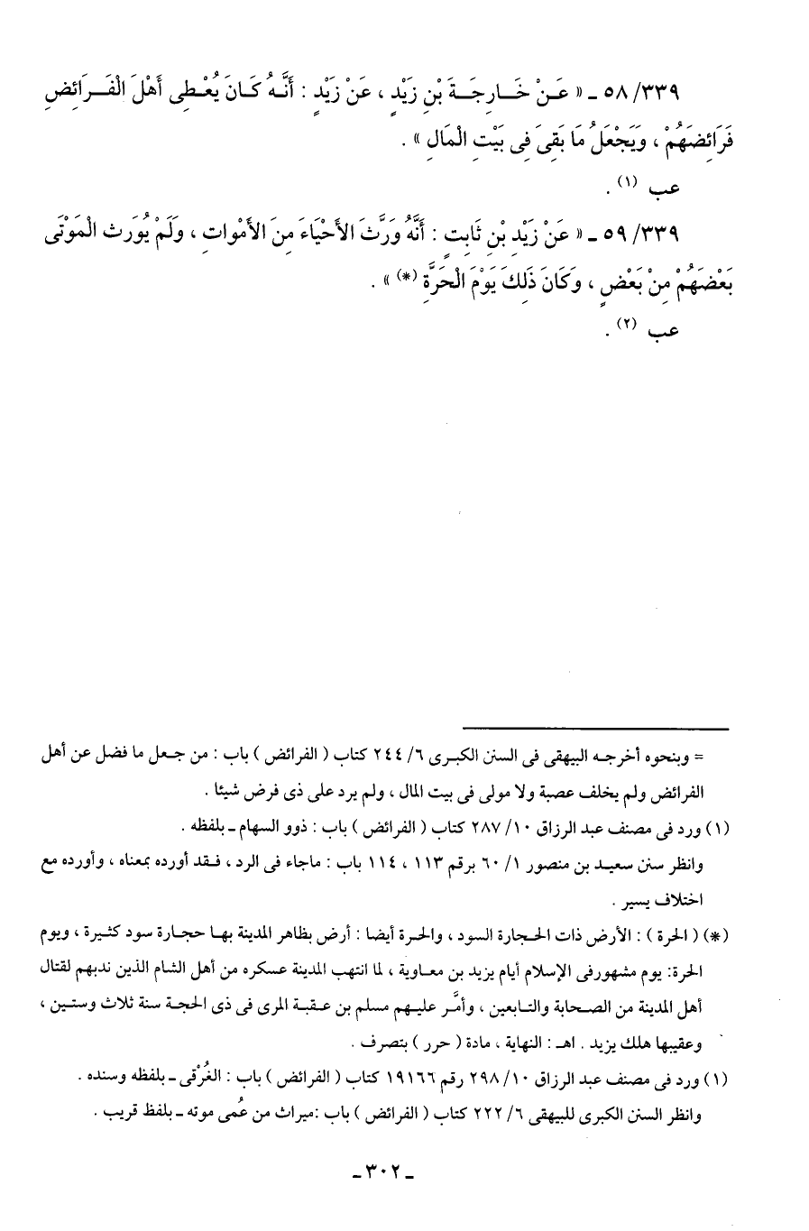 339/ 59 - "عَنْ زَيْدِ بْنِ ثَابِتٍ: أَنَّهُ وَرَّثَ الأَحْيَاءَ مِنَ الأَمْواتِ، وَلَمْ يُوَرث الْمَوْتَى بَعْضَهُمْ مِنْ بَعْضٍ، وَكَانَ ذَلِكَ يَوْمَ الْحَرَّةِ (*) ".