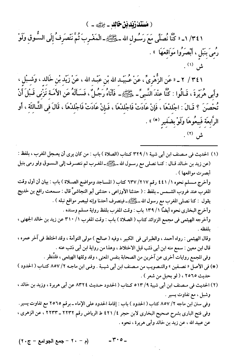 (¬1) الحديث في مصنف ابن أبى شيبة 1/ 329 كتاب (الصلاة) باب: من كان يرى أن يعجل المغرب، بلفظ: (عن زيد بن خالد قال: كنا نصلى مع رسول الله - صلى الله عليه وسلم - المغرب ثم ننصرف إلى السوق ولو رمى بنبل أبصرت مواقعها).