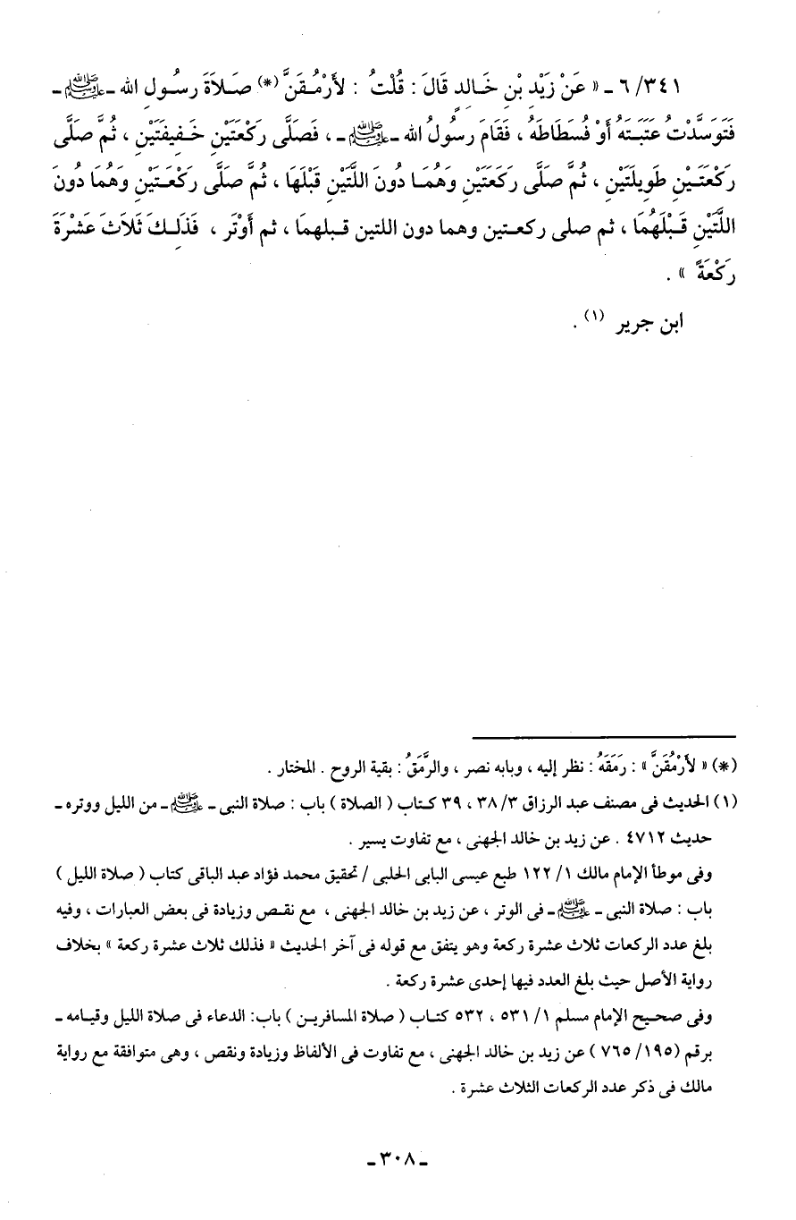 341/ 6 - "عَنْ زَيْدِ بْنِ خَالِدٍ قَالَ: قُلْتُ: لأَرْمُقَنَّ (*) صَلَاةَ رسُولِ الله -صلى الله عليه وسلم- فَتَوَسَّدْتُ عَتَبَتَهُ أَوْ فُسَطَاطَهُ، فَقَامَ رسُولُ الله -صلى الله عليه وسلم-، فَصَلَّى رَكْعَتَيْنِ خَفِيفَتَيْنِ، ثُمَّ صَلَّى رَكْعَتَيْنِ طَوِيلَتَيْنِ، ثُمَّ صَلَّى رَكَعَتَيْنِ وَهُمَا دُونَ اللَّتَيْنِ قَبْلَهَا، ثُمَّ صَلَّى رَكْعَتَيْنِ وَهُمَا دُونَ اللَّتَيْنِ قَبْلَهُمَا، ثم صلى ركعتين وهما دون اللتين قبلهمَا، ثم أَوْتَر، فَذَلِكَ ثَلَاثَ عَشْرَةَ رَكْعَةً".