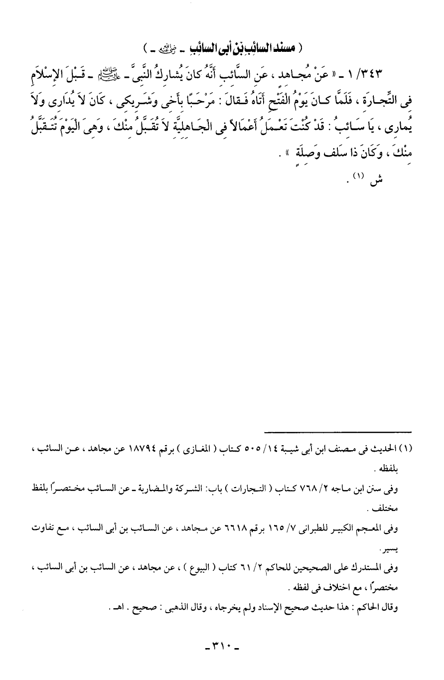 343/ 1 - " عَنْ مُجاهِدٍ، عَنِ السَّائِبِ أَنَّهُ كانَ يُشارِكُ النَّبِىَّ -صلى الله عليه وسلم- قَبْلَ الإِسْلَامِ فِى التِّجارَةِ، فَلَمَّا كانَ يَوْمُ الْفَتْحِ أَتَاهُ فَقالَ: مَرْحَبًا بِأَخِى وَشَرِيكِى، كانَ لَا يُدَارِى وَلَا يُمارِى، يَا سَائِبُ: قَدْ كُنْتَ تَعْمَلُ أَعْمَالًا فِى الْجَاهِلِيَّةِ لَا تُقَبَّلُ مِنْكَ، وَهِىَ اليَوْمَ تُتَقَبَّلُ مِنْكَ، وَكانَ ذا سَلف وَصِلَةٍ".