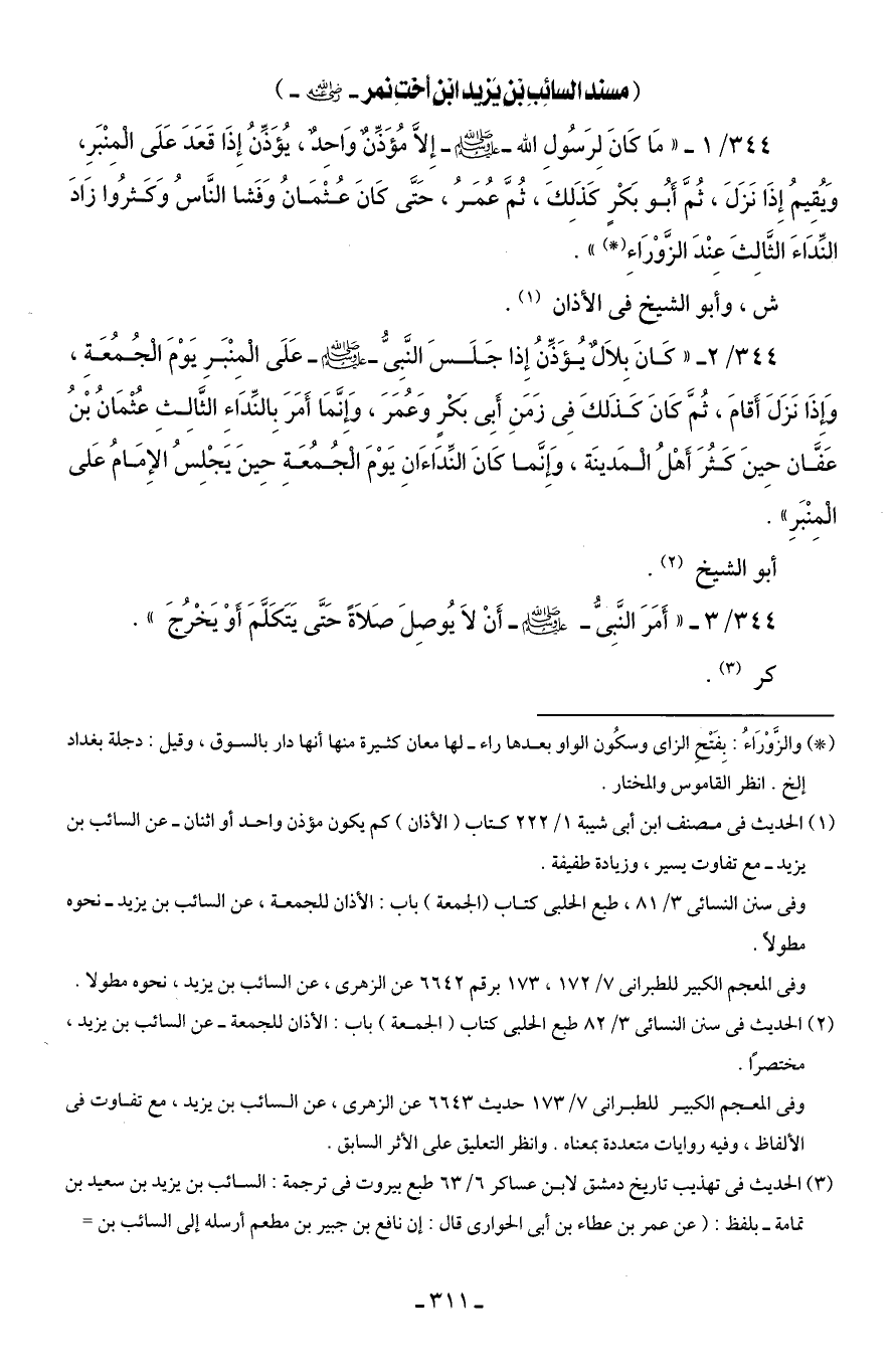 (¬1) الحديث في مصنف ابن أبى شيبة 1/ 222 كتاب (الأذان) كم يكون مؤذن واحد أو اثنان - عن السائب بن يزيد- مع تفاوت يسير، وزيادة طفيفة.
