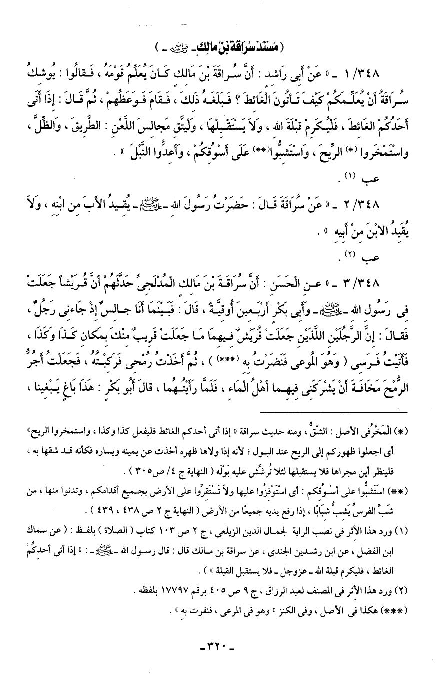 348/ 1 - " عَنْ أَبِى رَاشِدٍ: أَنَّ سُراقَةَ بْنَ مَالِكٍ كَانَ يُعَلِّمُ قَوْمَهُ، فَقالُوا: يُوشِكُ سُرَاقَةُ أَنْ يُعَلِّمَكُمْ كيْفَ تَأتُونَ الْغَائِطَ؟ فَبَلَغَهُ ذَلِكَ، فَقَامَ فَوَعَظُهمْ، ثُمَّ قَالَ: إِذَا أَتَى أَحَدُكُمْ الغَائِطَ، فَلْيُكَرِمْ قبْلَةَ اللهِ، وَلَا يَسْتَقْبِلْهَا، وَلْيتَّقِ مَجالِسَ اللَّعْنِ: الطَّرِيقَ، وَالظِّلَّ، واسْتَمْخَروا (*) الرِّيحَ، وَاسْتَشِبُّوا (* *) عَلَى أَسْوُقِكُمْ، وَأَعِدُّوا النَّبْلَ".