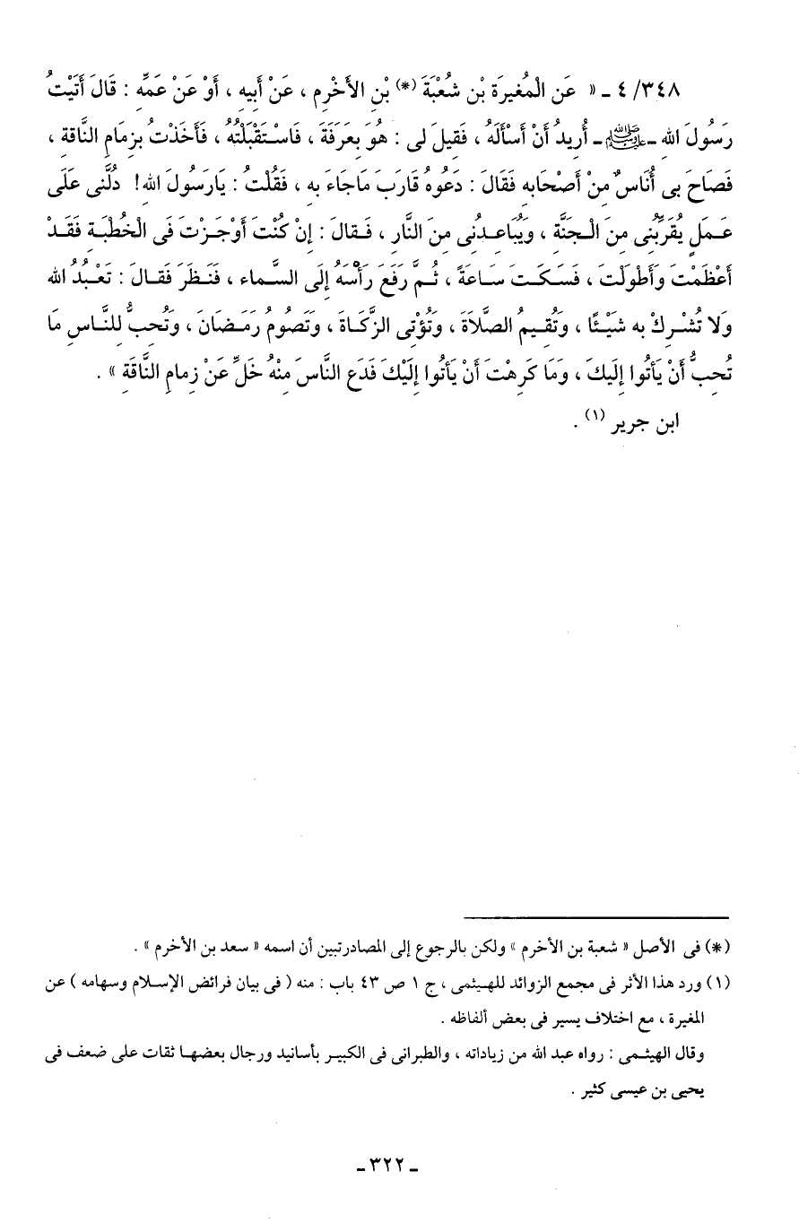 348/ 4 - "عَن الْمُغيرَة بْن شُعْبَةَ (*) بْنِ الأَخْرِم، عَنْ أَبِيهِ، أَوْ عَنْ عَمِّهِ: قَالَ أَتَيْتُ رَسُولَ اللهِ -صلى الله عليه وسلم- أُرِيدُ أَنْ أَسْأَلَهُ، فَقِيلَ لى: هُوَ بِعَرَفَةَ، فَاسْتَقْبَلْتُهُ، فَأَخَذْتُ بزِمَامِ النَّاقةِ، فَصَاحَ بى أُنَاسٌ مِنْ أَصْحَابهِ فَقَالَ: دَعُوهُ قَارَبَ مَا جَاءَ بهِ، فَقُلْتُ: يَا رَسُولَ اللهِ! دُلَّنى عَلَى عَمَلٍ يُقَرِّبُنِى مِنَ الْجَنَّةِ، وَيُبَاعِدُنِى مِنَ النَّارِ، فَقالَ: إِنْ كُنْتَ أَوْجَزْتَ فَى الْخُطْبَةِ فَقَدْ أَعْظَمْتَ وَأَطْوَلْتَ، فَسَكَتَ سَاعَةً، ثُمَّ رَفَعَ رَأْسَهُ إِلَى السَّماء، فَنَظَرَ فَقالَ: تَعْبُدُ الله وَلا تُشْرِكْ به شَيْئًا، وَتُقِيمُ الصَّلَاةَ، وَتُؤْتِى الزَّكَاةَ، وَتَصُومُ رَمَضَانَ، وَتُحِبُّ لِلنَّاسِ مَا تُحِبُّ أَنْ يَأتُوا إِلَيكَ، وَمَا كَرِهْتَ أَنْ يَأتُوا إِلَيْكَ فَدَع النَّاسَ مِنْهُ خَلِّ عَنْ زِمامِ النَّاقَةِ".
