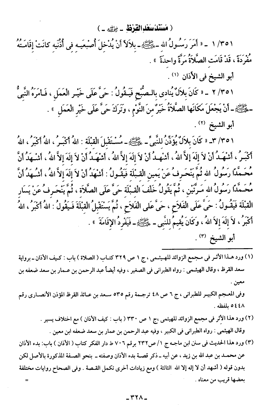 351/ 3 - "كَانَ بِلَالٌ يُؤَذِّنُ لِلنَّبىِّ -صلى الله عليه وسلم- مُسْتَقْبِلَ الْقِبْلَةِ: اللهُ أَكْبَرُ، اللهُ أَكْبَرُ، اللهُ أَكْبَرُ، أَشْهَدُ أَنْ لَا إِلَهَ إلَّا اللهُ، أَشْهدُ أَنْ لَا إِلَهَ إِلَّا اللهُ، أَشْهَدُ أَنْ لَا إِلَهَ إِلَّا اللهُ، أَشْهَدُ أَنَّ مُحَمَّدًا رَسُولُ اللهِ ثُمَّ يَنْحَرِفُ عَنْ يَمِينِ الْقِبْلَةِ فَيَقُولُ: أَشْهَدُ أَنْ لَا إِلَهَ إِلَّا اللهُ، أَشُهَدُ أَنَّ مُحَمَّدًا رَسُولُ اللهِ مَرَّتَيْنِ، ثُمَّ يَقُولُ خَلْفَ الْقِبْلَةِ حَىَّ عَلَى الصَّلَاة، ثُمَّ يَنْحَرِفُ عَنْ يَسَارِ الْقبْلَة فَيَقُولُ: حَىَّ عَلَى الفَلَاحِ، حَىَّ عَلى الْفَلَاحِ، ثُمَّ يَسْتَقْبِلُ الْقِبْلَةَ فَيَقُولُ: اللهُ أَكْبَرُ، اللهُ أَكْبَرُ، لَا إِلَهَ إِلَّا اللهُ، وَكَانَ يُقِيمُ لِلنَّبِى -صلى الله عليه وسلم- فَيَفْرِدُ الإِقَامَةَ".