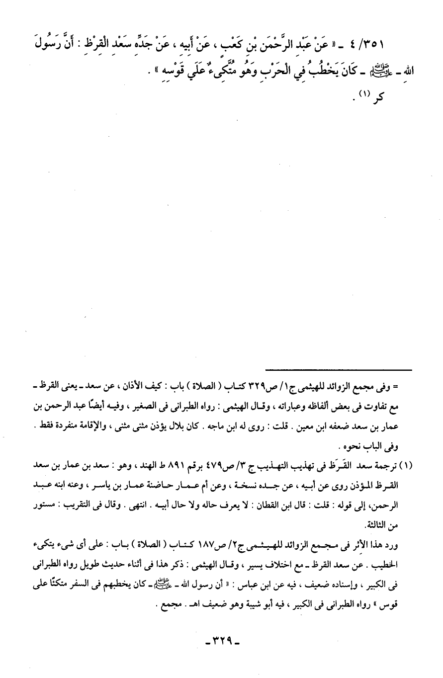 351/ 4 - "عَنْ عَبْدِ الرَّحْمَن بْنِ كَعْبٍ، عَنْ أَبِيهِ، عَنْ جَدِّهِ سَعْدِ الْقِرْظِ: أَنَّ رَسُولَ اللهِ -صلى الله عليه وسلم- كَانَ يَخْطُبُ فِي الْحَرْبِ وَهُو مُتَّكِئٌ عَلَى قَوْسِهِ".