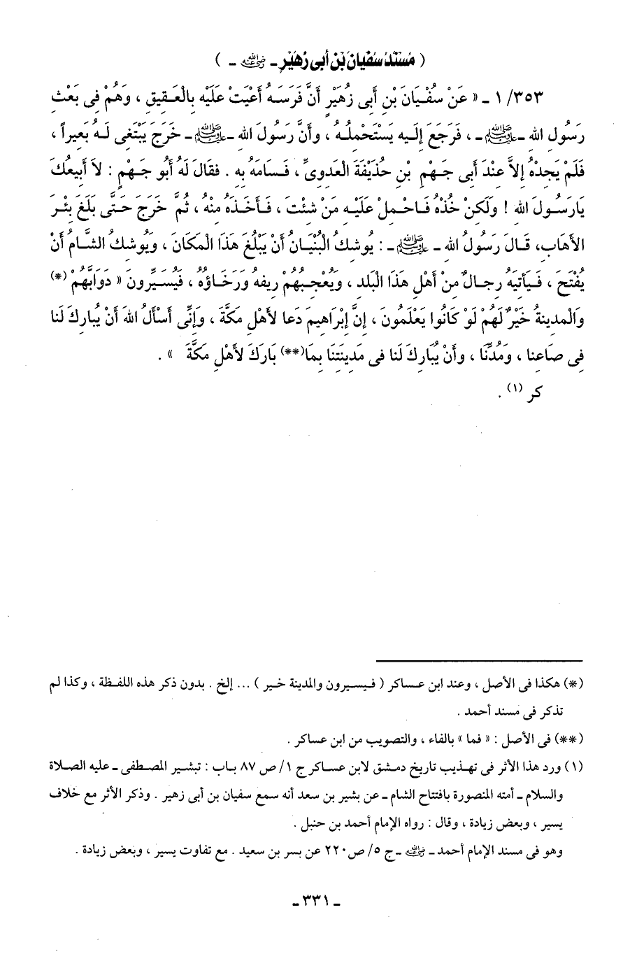 353/ 1 - " عَنْ سُفْيَانَ بْنِ أَبِى زُهَيْرٍ أَنَّ فَرَسَهُ أَعْيَتْ عَلَيْه بِالْعَقِيقِ، وَهُمْ فِى بَعْثِ رَسُولِ اللهِ - صلى الله عليه وسلم -، فَرَجَعَ إِلَيه يَسْتَحْمِلُهُ، وأَنَّ رَسُولَ اللهِ -صلى الله عليه وسلم- خَرَجَ يَبْتَغِى لَهُ بَعِيرًا، فَلَمْ يَجِدْهُ إِلَّا عِنْدَ أَبِى جَهْمِ بْنِ حُذَيْفَةَ الْعَدِوِىِّ، فَسَامَهُ بِهِ. فقَالَ لَهُ أَبُو جَهْمٍ: لَا أَبِيعُكَ يَا رَسُولَ اللهِ! وَلَكِنْ خُذْهُ فَاحْمِلْ عَلَيْهِ مَنْ شِئْتَ، فَأَخَذَهُ مِنْهُ، ثُمَّ خَرَجَ حَتَّى بَلَغَ بِئْرَ الأَهَابِ، قَالَ رَسُولُ اللهِ - صلى الله عليه وسلم -: يُوشِكُ الْبُنْيَانُ أَنْ يَبْلُغَ هَذَا الْمَكَانَ، وَيُوشِكُ الشَّامُ أَنْ يُفْتَحَ، فَيَأتِيَهُ رِجالٌ مِنْ أَهْلِ هَذَا الْبَلدِ، وَيُعْجِبُهُمْ رِيفهُ وَرَخَاؤُهُ، فَيُسَيِّرونَ "دَوَابَّهُمْ (*) وَالْمدِينةُ خَيْرٌ لَهُمْ لَوْ كَانُوا يَعْلَمُونَ، إِنَّ إِبْرَاهِيمَ دَعا لأَهْلِ مَكَّةَ، وَإِنِّى أَسْأَلُ اللهَ أَنْ يُبارِكَ لَنا فِى صَاعِنا، وَمُدِّنَا، وأَنْ يُبَارِكَ لَنا في مَدِينَتِنَا بِمَا (* *) بَارَكَ لأَهْلِ مَكَّةَ".
