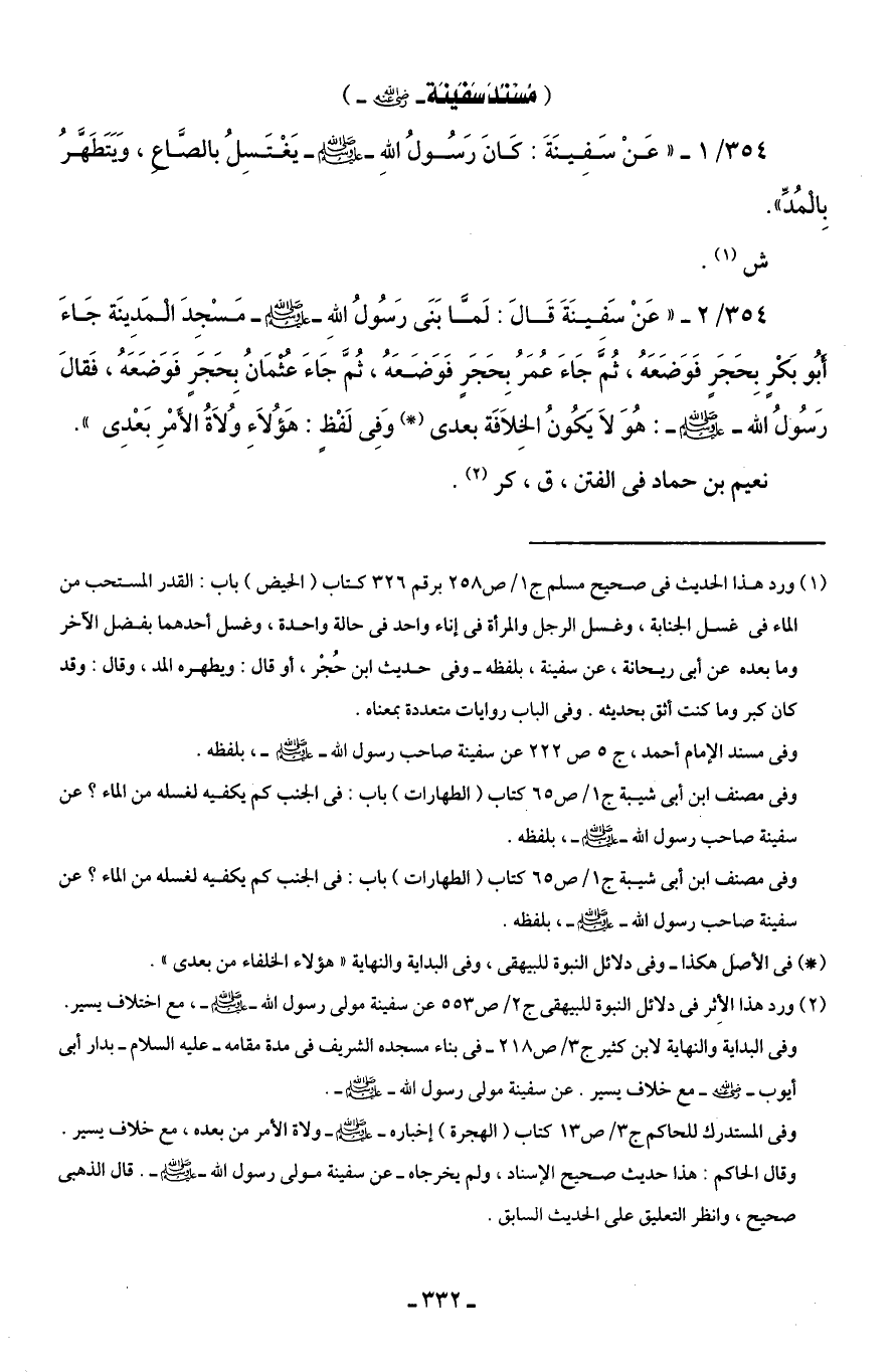 354/ 1 - " عَنْ سَفِينَةَ: كَانَ رَسُولُ اللهِ - صلى الله عليه وسلم - يَغْتَسِلُ بالصَّاعِ، وَيَتَطَهَّرُ بِالْمُدِّ".