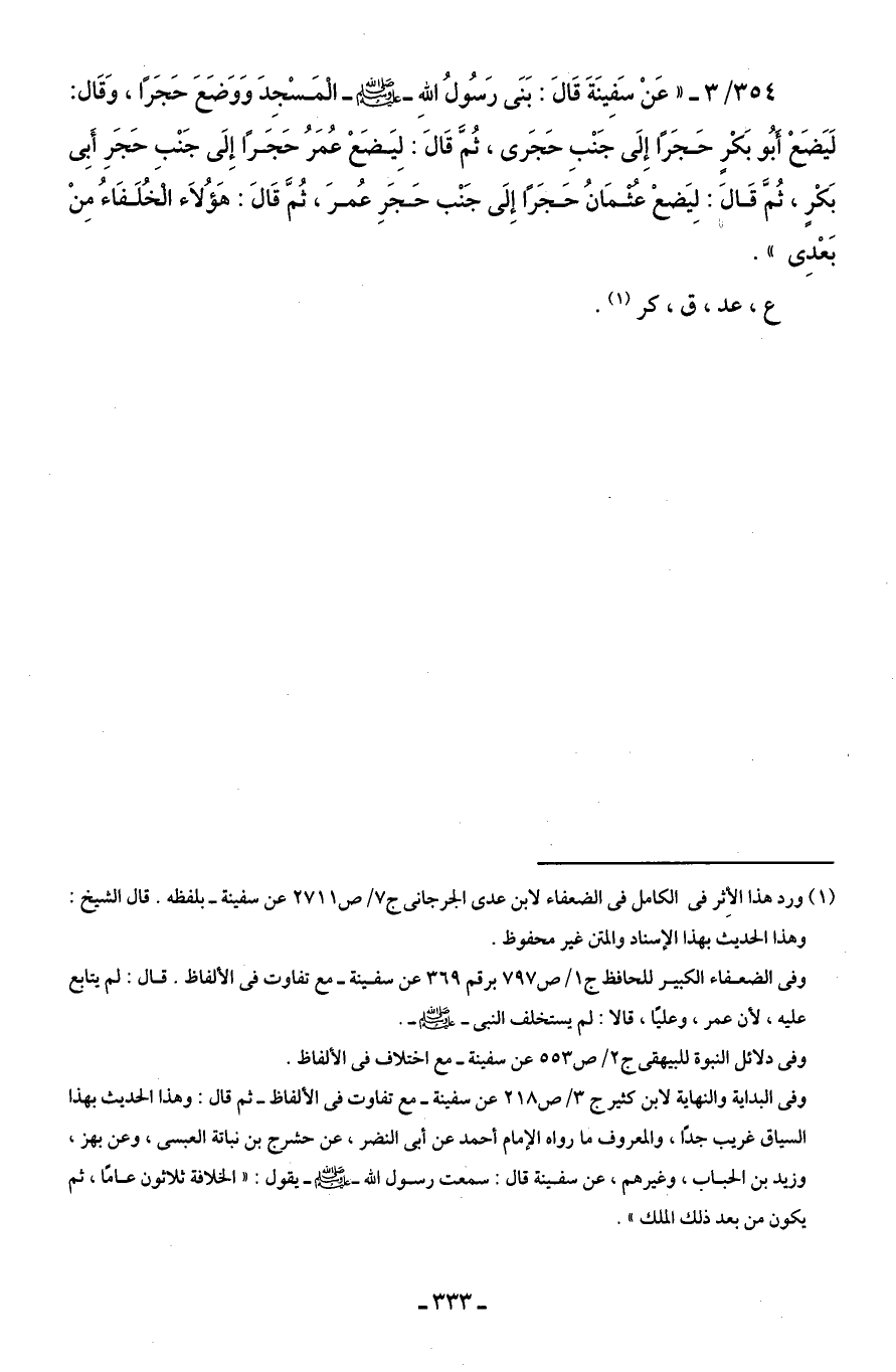 354/ 3 - "عَنْ سَفِينَةَ قَالَ: بَنَى رَسُولُ اللهِ - صلى الله عليه وسلم - الْمَسْجِدَ وَوَضَعَ حَجَرًا، وَقَال: لَيَضَعْ أَبُو بَكْرٍ حَجَرًا إِلَى جَنْبِ حَجَرى، ثُمَّ قَالَ: لِيَضَعْ عُمَرُ حَجَرًا إِلَى جَنْبِ حَجَرِ أَبِى بَكْرٍ، ثُمَّ قَالَ: لِيَضعْ عُثْمَانُ حَجَرًا إِلَى جَنْب حَجَرِ عُمرَ، ثُمَّ قَالَ: هَؤُلَاء الْخُلَفَاءُ مِنْ بَعْدِى".