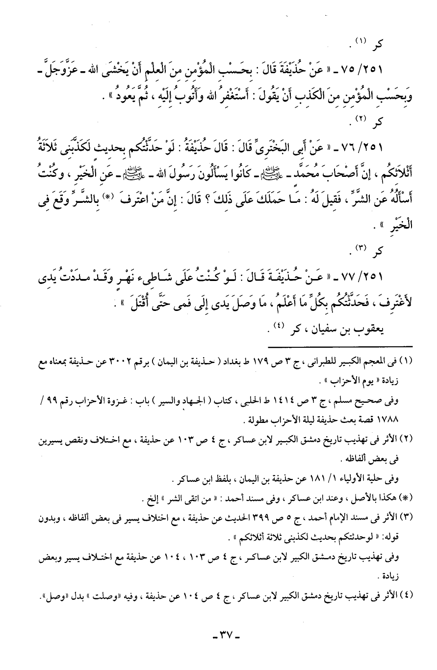 251/ 77 - "عَنْ حُذَيْفَةَ قَالَ: لَوْ كُنْتُ عَلَى شَاطِئ نَهْرٍ وَقَدْ مدَدْتُ يَدِى لأَغْتَرِفَ، فَحَدَّثْتُكُم بِكُلِّ مَا أَعْلَمُ، مَا وَصَلَ يَدى إِلَى فَمى حَتَّى أُقْتَلَ".