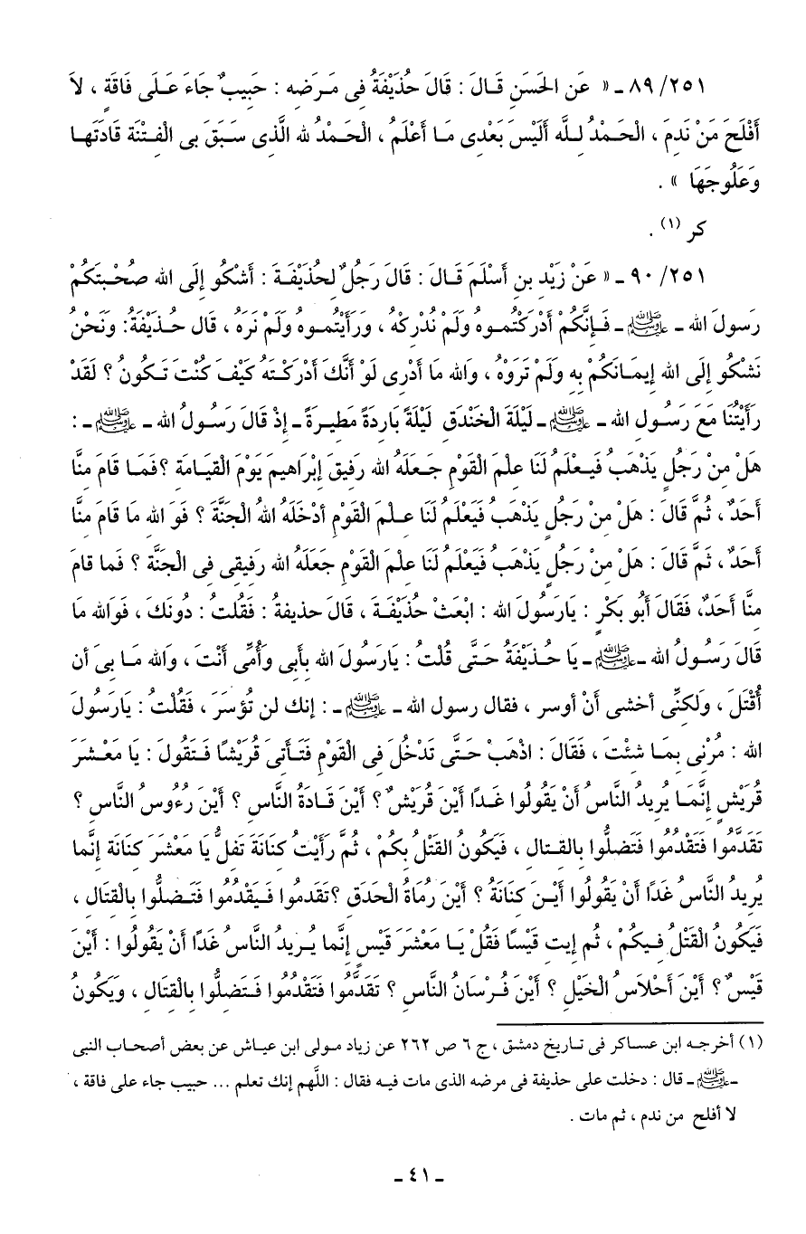 251/ 90 - "عَنْ زَيْدِ بنِ أَسْلَمَ قَالَ: قَالَ رَجُلٌ لِحُذَيْفَةَ: أَشْكُو إِلَى الله صُحْبَتَكُمْ رَسولَ الله - صلى الله عليه وسلم - فَإِنَّكُمْ أَدْرَكْتُموهُ وَلَمْ نُدْرِكْهُ، وَرَأَيْتُموهُ وَلَمْ نَرَهُ، قَال حُذَيْفَةُ: وَنَحْنُ نَشْكُو إِلَى الله إِيمَانَكُمْ بِهِ وَلَمْ تَرَوْهُ، وَالله مَا أَدْرِى لَوْ أَنَّكَ أدْرَكْتَهُ كَيْفَ كُنْتَ تَكُونُ؟ لَقَدْ رَأَيْتُنَا معَ رَسُولِ الله - صلى الله عليه وسلم - لَيْلَةَ الْخَنْدَقِ لَيْلَةً بَارِدَةً مَطِيرَةً - إِذْ قَالَ رَسُولُ الله - صلى الله عليه وسلم -: هَلْ مِنْ رَجُلٍ يَذْهَبُ فَيعْلَمُ لَنَا عِلْمَ الْقَوْمِ جَعَلَهُ الله رَفيقَ إِبْرَاهيمَ يَوْمَ الْقيَامَةِ؟ فَمَا قَامَ مِنَّا أَحَدٌ، ثُمَّ قَالَ: هَلْ مِنْ رَجُلٍ يَذْهَبُ فَيَعْلَمُ لَنَا عِلْمَ الْقَوْمِ أدْخَلَهُ اللهُ الْجَنَّةَ؟ فَوَاللهِ مَا قَامَ مِنَّا أَحَدٌ، ثَمَّ قَالَ: هَلْ مِنْ رَجُلٍ يَذْهَبُ فَيَعْلَمُ لَنَا عِلْمَ الْقَوْمِ جَعَلَهُ الله رَفِيقِى فِى الْجَنَّةَ؟ فَما قامَ مِنَّا أَحَدٌ، فَقَالَ أَبُو بَكْرٍ: يَا رَسُولَ الله: ابْعَثْ حُذَيْفَةَ، قَالَ حذيفةُ: فَقُلتُ: دُونَكَ، فَوَالله مَا قَالَ رَسُولُ الله - صلى الله عليه وسلم - يَا حُذَيْفَةُ حَتَّى قُلْتُ: يَا رَسُولَ الله بِأَبِى وَأُمِّى أَنْتَ، وَالله مَا بِىَ أن أُقْتَلَ، وَلكِنِّى أخشى أَنْ أوسر، فقال رسول الله - صلى الله عليه وسلم -: إنك لن تُؤسَرَ، فَقُلْتُ: يَا رَسُولَ الله: مُرْنِى بِمَا شِئْتَ، فَقَالَ: اذْهَبْ حَتَّى تَدْخُلَ فِى الْقَوْمِ فَتَأَتِىَ قُرَيْشًا فَتَقُولَ: يَا مَعْشَرَ قُرَيْشٍ إِنَمَا يُرِيدُ النَّاسُ أَنْ يَقُولُوا غَدًا أَيْنَ قُرَيْشٌ؟ أَيْنَ قَادَةُ النَّاسِ؟ أَيْنَ رُءُوسُ النَّاسِ؟ تَقَدَّمُوا فَتَقْدُمُوا فَتَضلُّوا بِالقِتالِ، فَيَكُونُ القَتْلُ بِكُمْ، ثُمَّ رَأَيْتُ كِنَانَةَ تَفِلُّ يَا مَعْشَرَ كِنَانَة إِنَّما يُرِيدُ النَّاسُ غَدًا أَنْ يَقُولُوا أَيْنَ كِنَانَةُ؟ أَيْنَ رمُاةُ الْحَدَقِ؟ تَقَدمُوا فَيَقْدُمُوا فَتَضلُّوا بِالْقِتَالِ، فَيَكُونُ الْقَتْلُ فِيكُمْ، ثُم إِيت قَيْسًا فَقُلْ يَا مَعْشَرَ قَيْسٍ إِنَّما يُريدُ النَّاسُ غَدًا أَنْ يَقُولُوا: أَيْنَ قَيْسٌ؟ أَيْنَ أَحْلَاسُ الْخَيْلِ؟ أَيْنَ فُرْسَانُ النَّاسِ؟ تَقَدَّمُوا فَتَقْدُمُوا فَتَضِلُّوا بِالْقِتَالِ، وَيَكُونُ