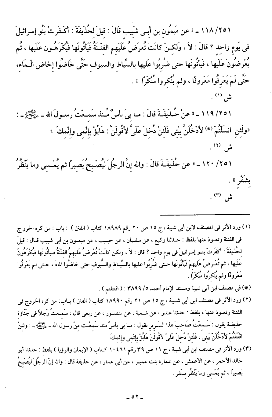 251/ 118 - "عن مَيمُونِ بن أَبِى شَبِيبٍ قَالَ: قِيلَ لِحُذَيفَةَ: أَكَفَرتْ بَنُو إسرائيلَ في يَومٍ واحِدٍ؟ قالَ: لَا، وَلكِنْ كانَتْ تُعرَضُ عَلَيْهِم الفِتْنَةُ فَيَأتُونَها فَيُكْرَهُون عَلَيها، ثُم يُعْرضُونَ عَلَيها، فَيأتُونَها حتى ضُرِبُوا عَليها بالسَّياطِ والسيوفِ حَتَّى خَاضُوا إِخاض الْمَاءِ، حَتَّى لَمْ يَعْرِفُوا مَعْروفًا، ولم يُنْكِروا مُنْكَرًا".