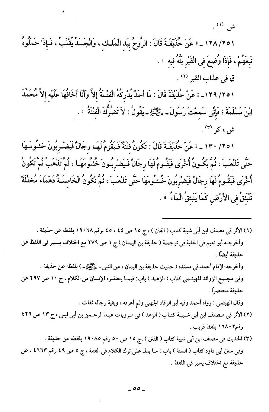 251/ 130 - "عَنْ حُذَيْفَةَ قَالَ: تَكُونُ فِتْنَةٌ فَيَقُومُ لَهَا رِجَالٌ فَيَضْرِبُونَ خشُومَهَا حَتَّى تَذْهَبَ، ثُمَّ يَكُونُ أُخْرَى فَيَقُومُ لَهَا رِجَالٌ فَيَضْرِبُونَ خُشُومَهَا، ثُمَّ تَذْهَبُ ثُمَّ تَكُونُ أُخْرَى فَيَقُومُ لَهَا رِجَالٌ فَيَضْرِبُونَ خُشُومَهَا حَتَّى تَذْهَبَ، ثُمَّ تَكُونُ الْخَامِسَةُ دَهْمَاءَ مُخلِّلَةً تَنْبَثِقُ فِى الأَرْضِ كَمَا يَنَبثِقُ الْمَاءُ".
