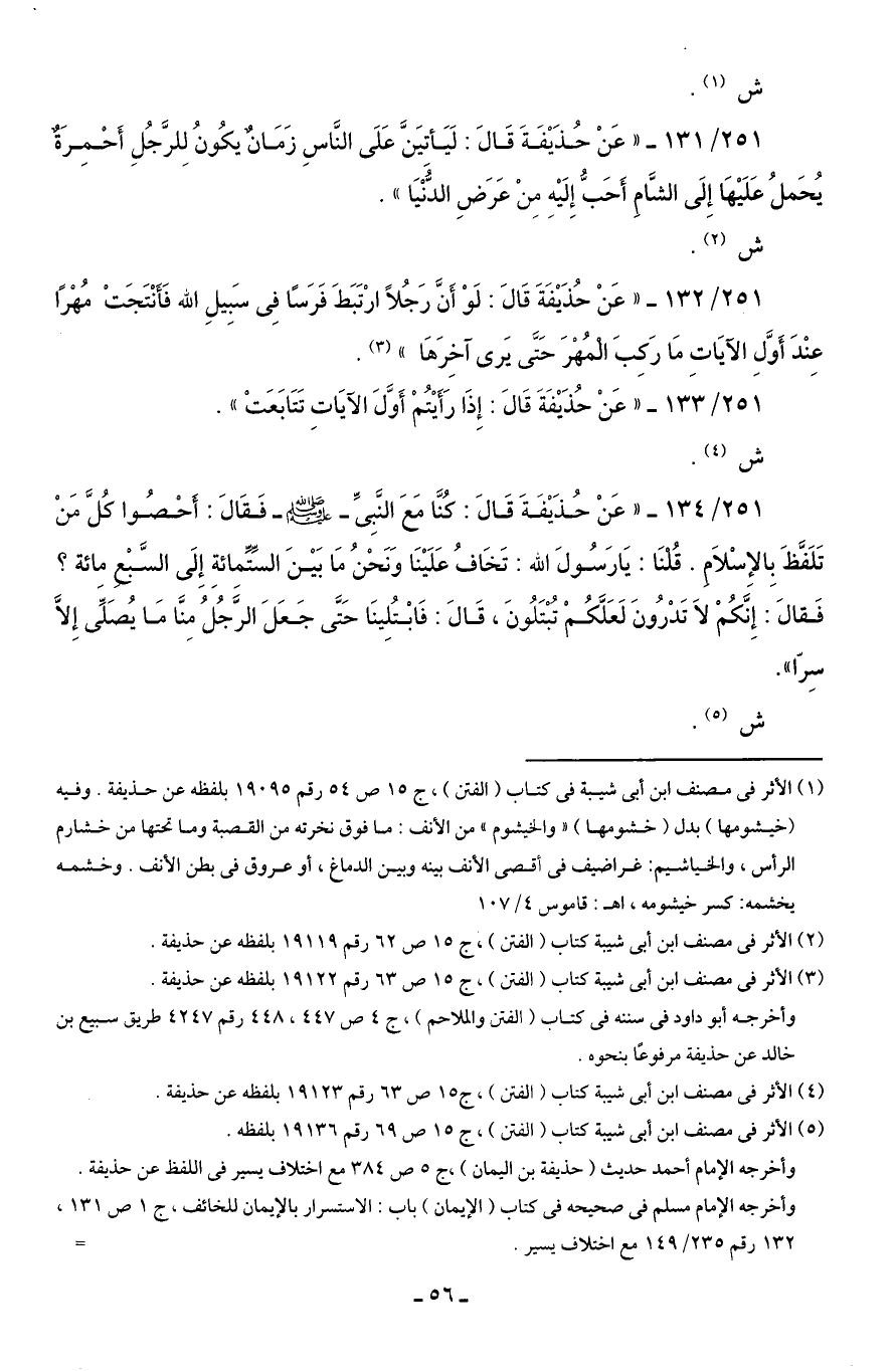 251/ 133 - "عَنْ حُذَيْفَةَ قَالَ: إِذَا رَأَيْتُمْ أَوَّلَ الآيَاتِ تَتَابَعَتْ".