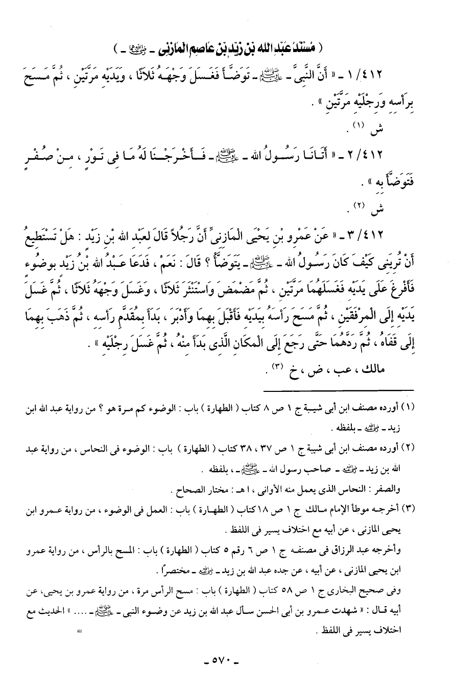 412/ 3 - "عَنْ عَمْرِو بْنِ يَحْيىَ المَازِنِىِّ أَنَّ رَجُلًا قَالَ لِعَبْدِ الله بْنِ زَيْدٍ: هَلْ تَسْتَطِيعُ أَنْ تُرِيَنِى كَيْفَ كَانَ رَسُولُ الله - صلى الله عليه وسلم - يَتَوَضَّأُ؟ قَالَ: نَعَمْ، فَدَعَا عَبْدُ الله بْنُ زَيْدٍ بوضُوء فَأفْرغَ عَلَى يَدَيْهِ فَغَسَلَهُمَا مَرَّتيْنِ، ثُمَّ مَضْمَضَ وَاسْتَنْثَرَ ثَلاثًا، وَغَسَلَ وَجْهَهُ ثَلاثًا، ثُمَّ غَسَلَ يَدَيْهِ إِلَى المِرْفَقَيْنِ، ثُمَّ مَسَحَ رَأسَهُ بِيَدَيْه فَأَقْبَلَ بِهِمَا وَأدْبَرَ، بَدَأَ بِمُقَدَّمِ رَأسِهِ، ثُمَّ ذَهَبَ بِهِمَا إِلَى قَفَاهُ، ثمَّ رَدَّهُمَا حتَّى رَجَعَ إِلَى المكَانِ الَّذِى بَدَأَ مِنْهُ، ثُمَّ غَسَلَ رِجْلَيْهِ".