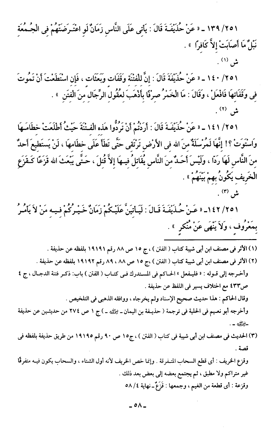 251/ 141 - "عَنْ حُذَيْفَةَ قَالَ: أَرَدْتُمْ أَنْ تَرُدُّوا هَذِهِ الْفِتْنَةَ حَيْثُ أَطْلَعَتْ خِطَامَهَا وَاسْتَوَتْ؟ ! إِنَّهَا لَمُرْسَلَةٌ مِنَ الله فِى الأَرْضِ تَرْتَقِى حَتَّى تَطَأَ عَلَى خطَامِهَا، لَنْ يَستَطِيعَ أَحدٌ مِنَ النَّاسِ لَهَا رَدّا، وَلَيْسَ أَحَدٌ مِنَ النَّاسِ يُقَاتِلُ فِيهَا إِلَّا قُتِلَ، حَتَّى يَبْعَثَ الله قَزَعًا كقَزَعِ الْخَرِيفِ يَكُونُ بِهِمْ بَيْنَهُمْ".